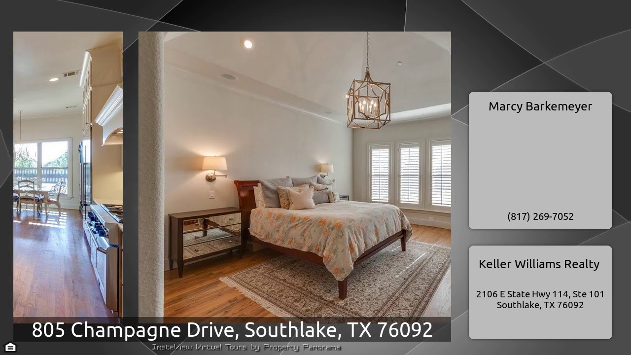 The Virtual Tour for the property at 805 Champagne Drive, Southlake, TX 76092 listed for $1,430,000: Other homes for sale by Marcy Barkemeyer of Keller Williams Realty: Gorgeous Carillon custom home. Spacious French inspired open plan is adorned with upgrades from groin vault & coffered ceilings to moldings & marble. The kitchen hosts Thermador appliances, wine refrigerator, over-sized island & breakfast bar, perfect for entertaining. Master suite features see through fireplace to bathroom featuring air tub, separate shower & large walk-in closet with steel tornado shelter. Second Master …