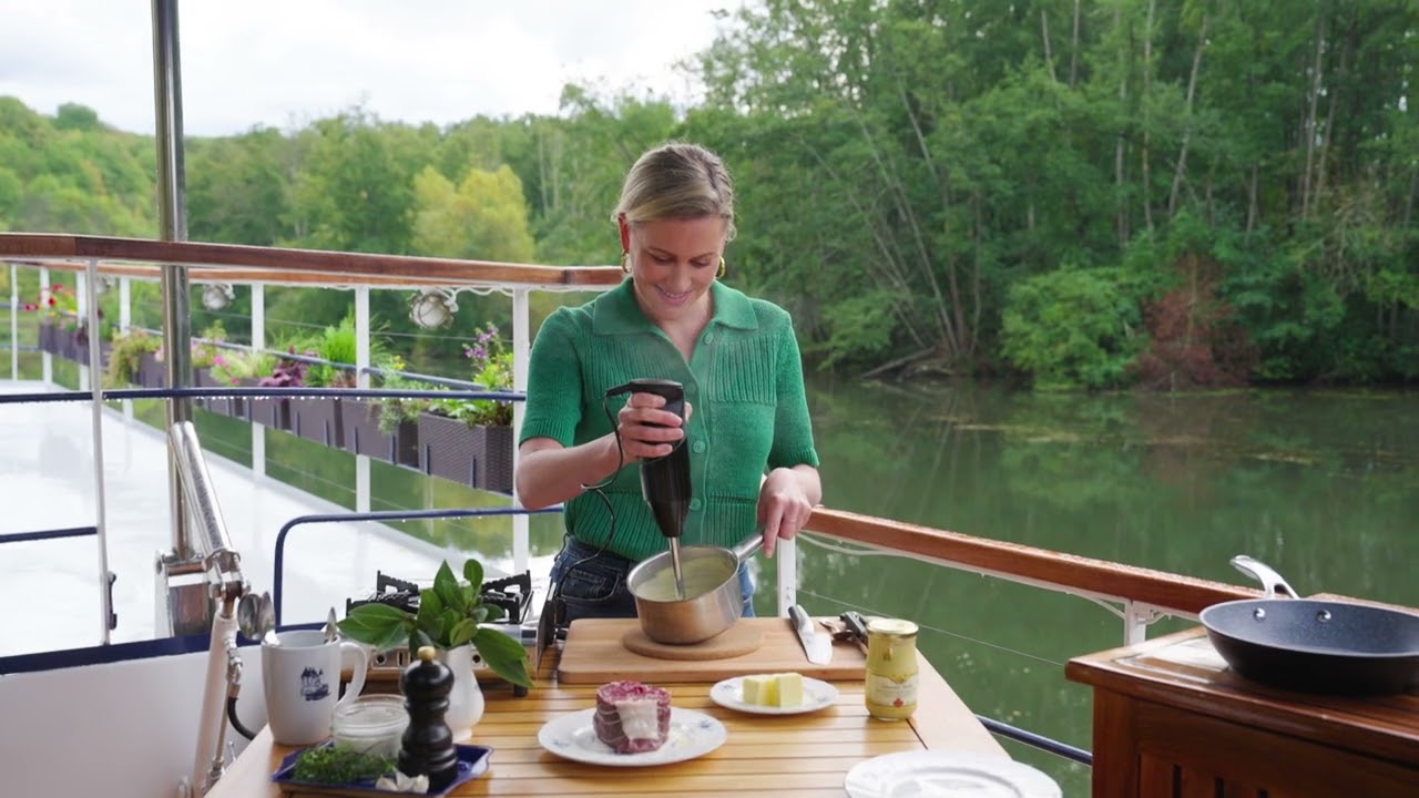 As Justine Schofield glided through the picturesque Burgundy region aboard our delightful hotel barge, La Belle Epoque, she prepared a French classic: Steak Frites. The perfectly cooked steak, accompanied by a tangy Dijon sauce and golden crispy fries, captured the essence of an authentic French bistro experience. Bon appétit!