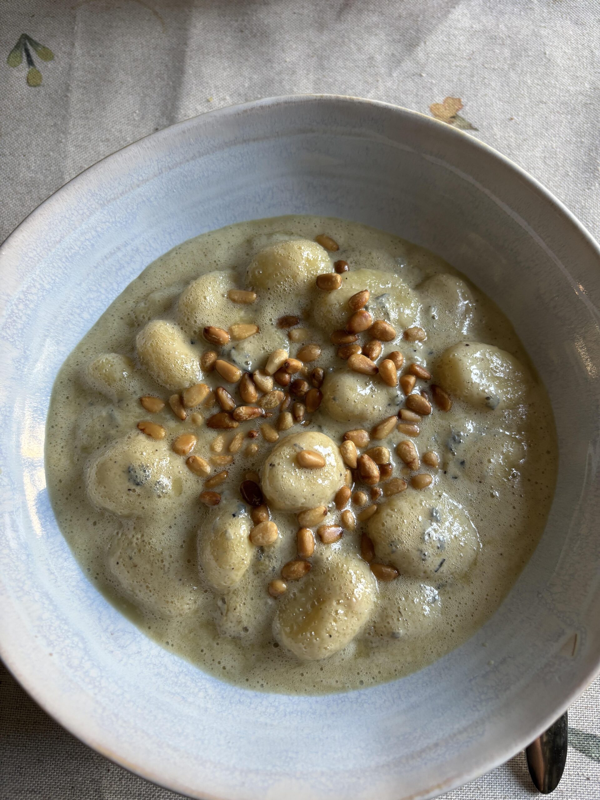 Gnocchis, sauce au bleu fermier et pignons torréfiés