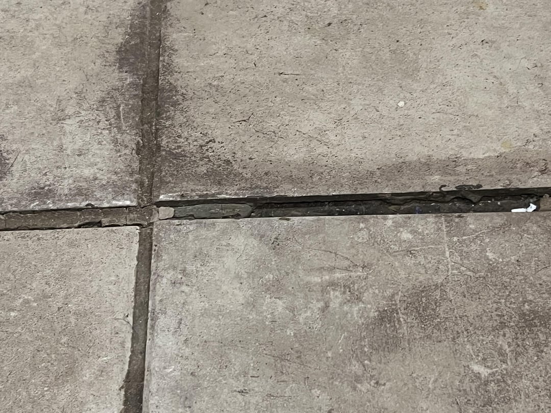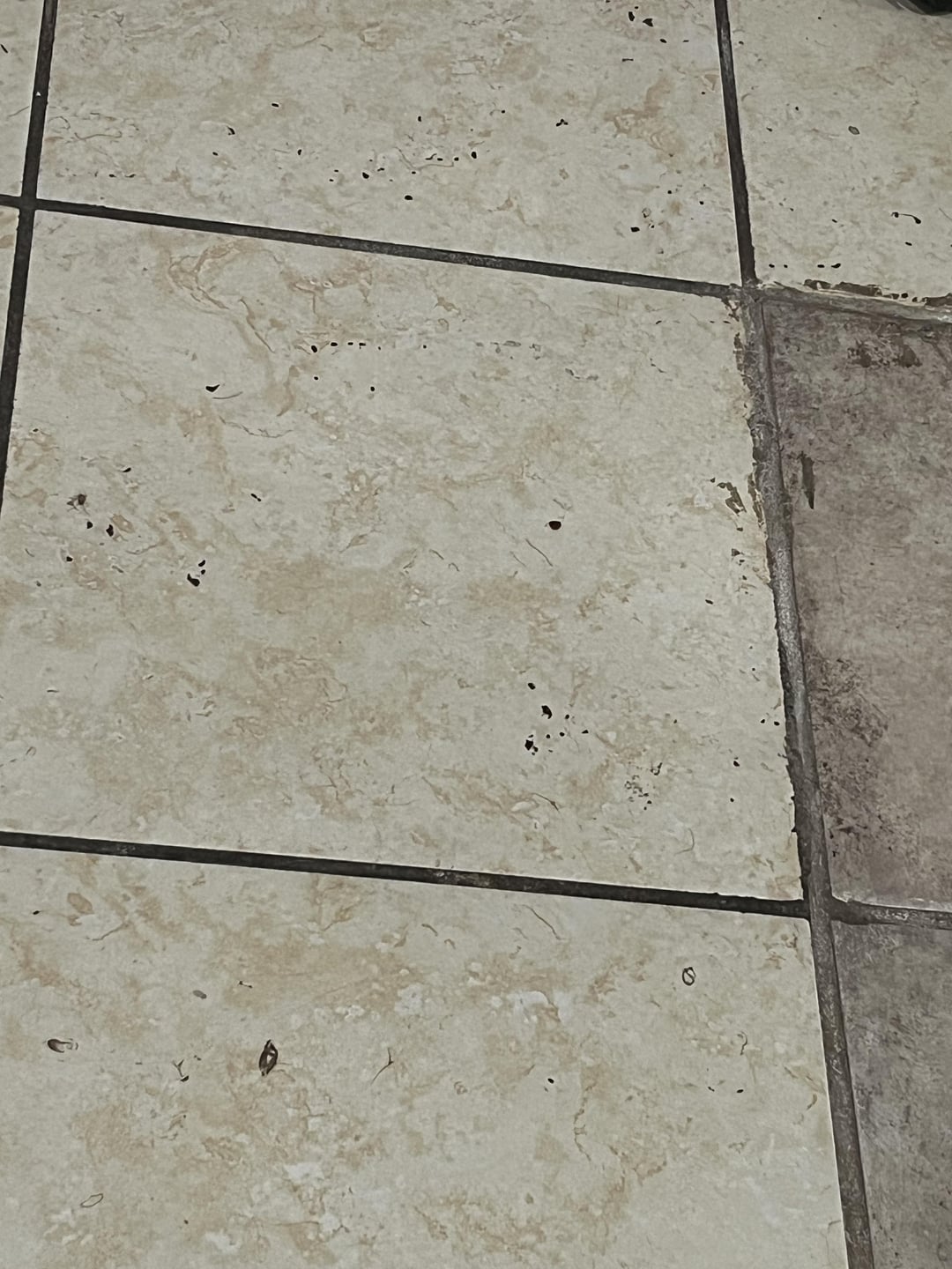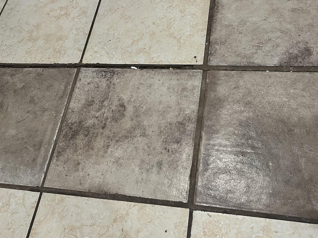 I’m guessing somebody tried to do an awful repair job on part of the floor. Apart from badly color matching, (the lighter tile is the correct one) the darker pieces are raised up, and there’s large cracks where grout is suppose to be.