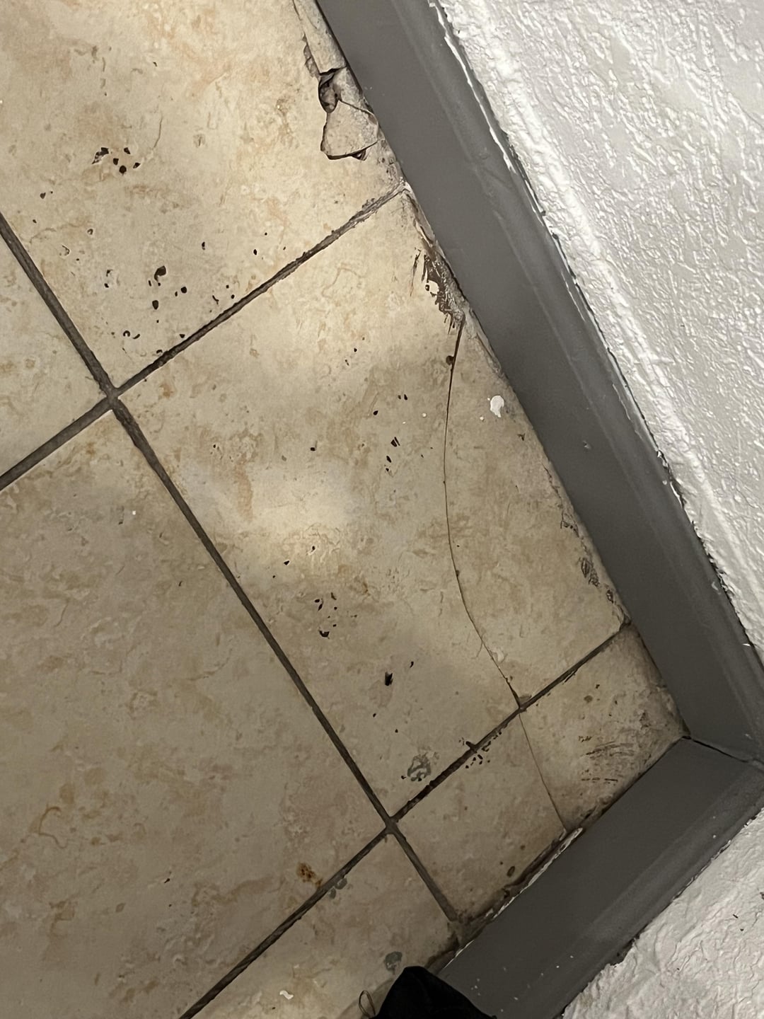Many tiles in the corners especially have pieces missing and/or are badly cracked.