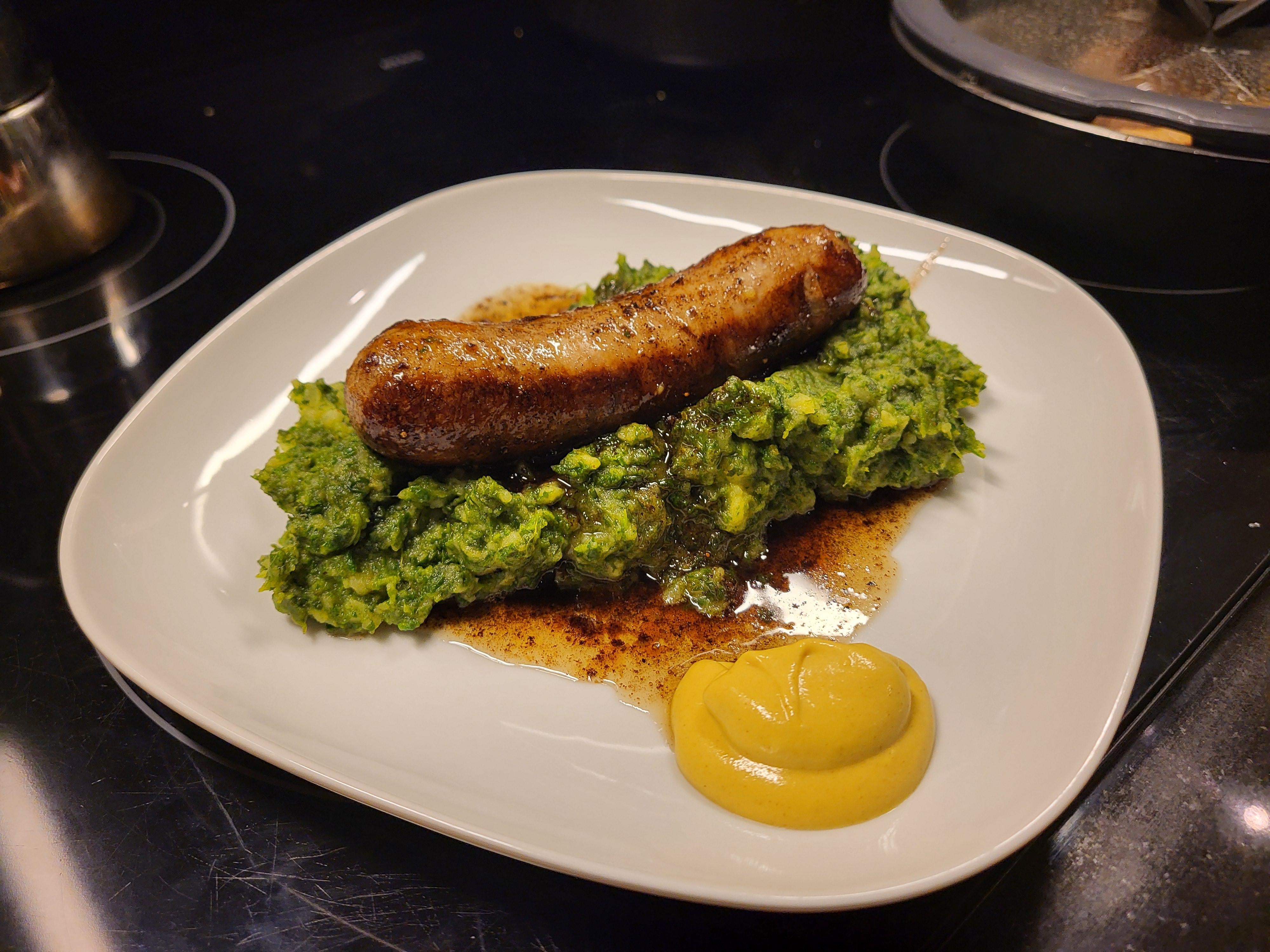“Stoemp” d’épinard, saucisse de campagne, moutarde de Dijon
