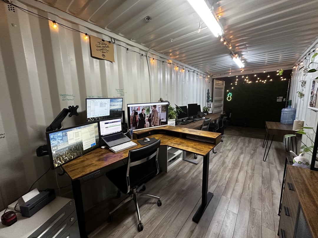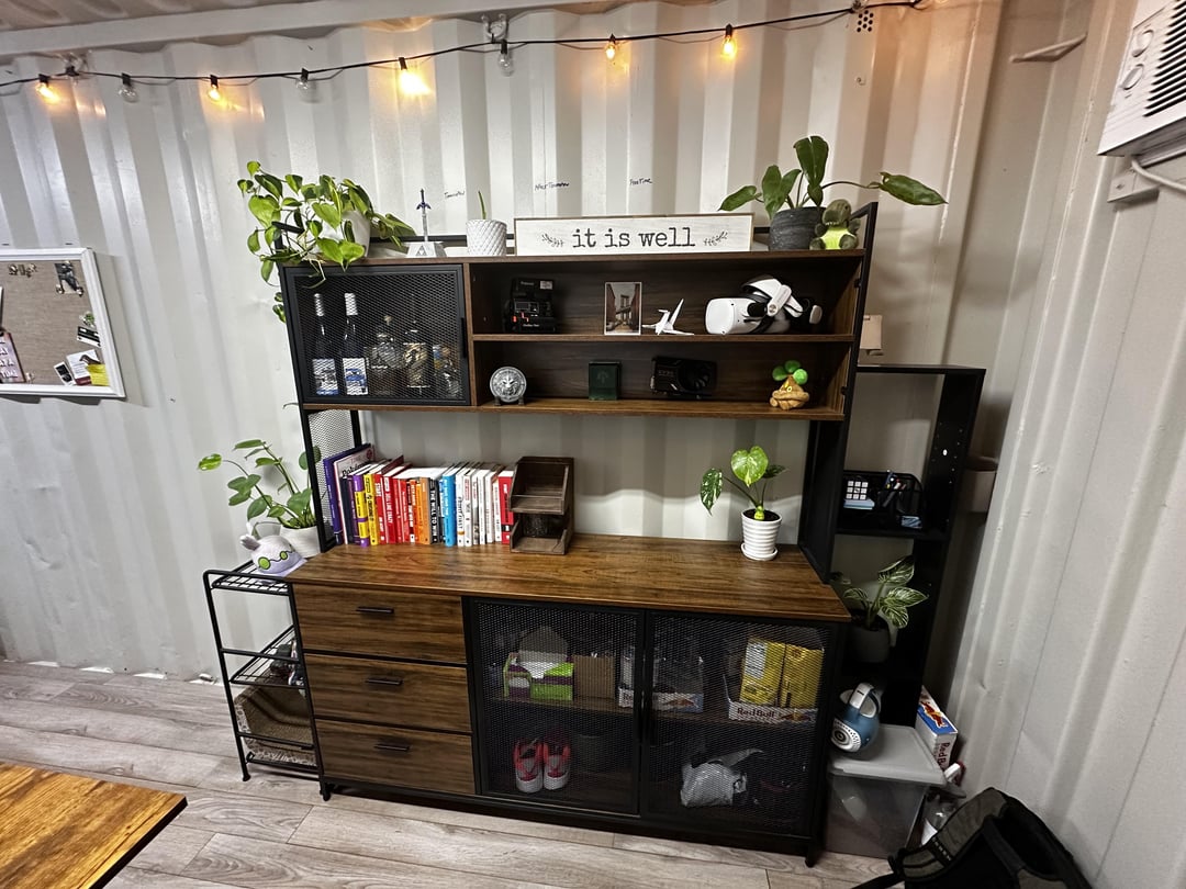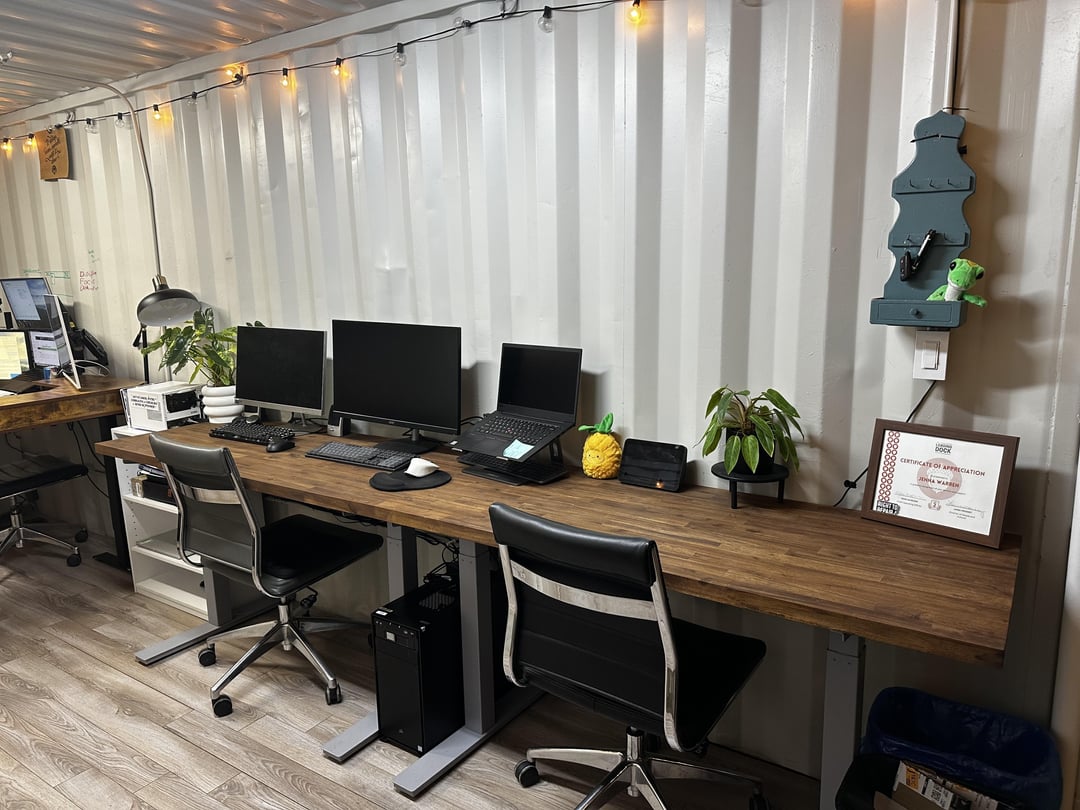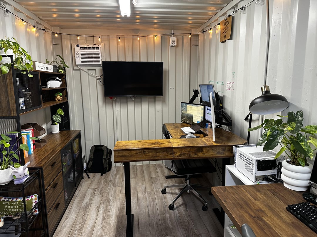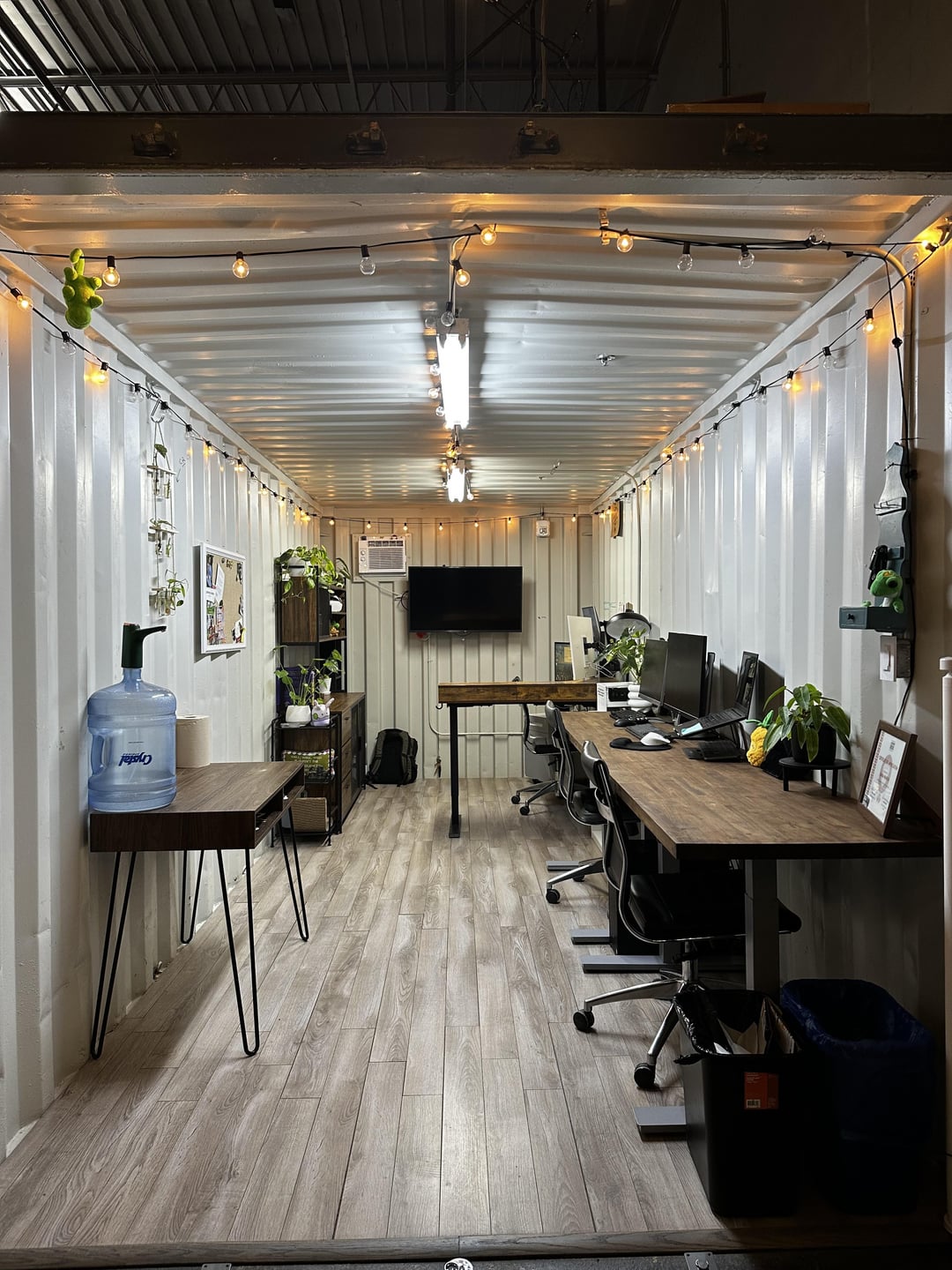 Recently added the 10 foot butcher block desk! It’s not a standing one yet, and at some point I’ll figure that out to remove the middle feet. Would love a couch, but I don’t think I could find one that aesthetically fits AND is narrow enough.