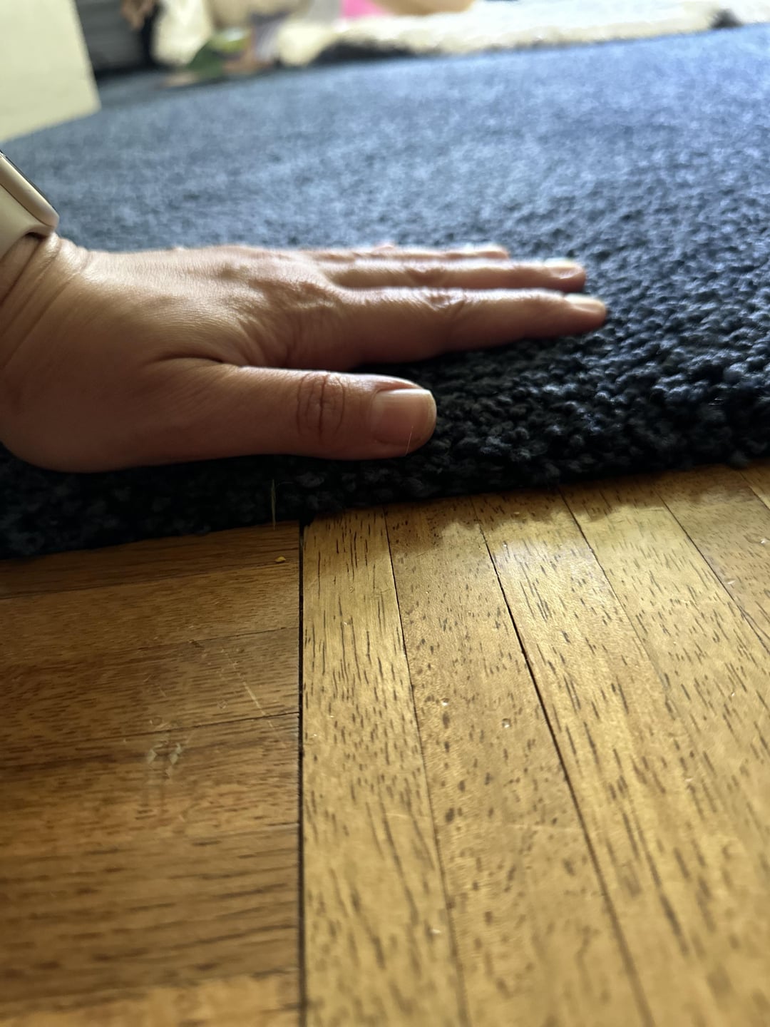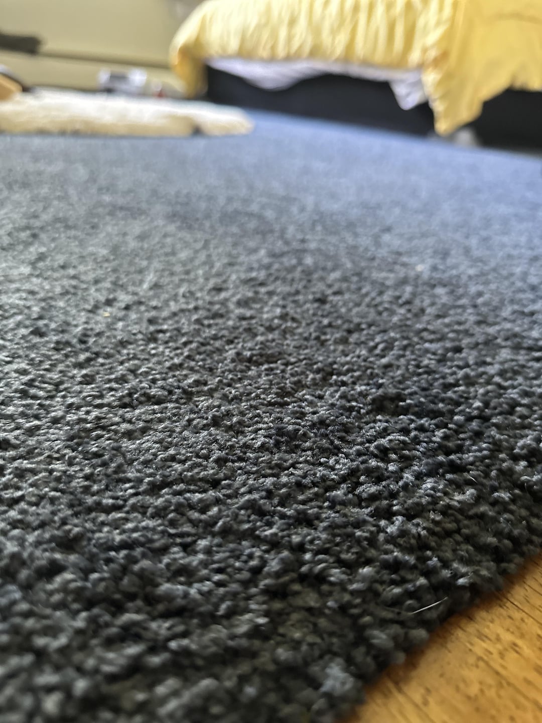 Any tips on how I can work around the carpet and still achieve a soft, feminine look? I’m open to ideas on decor, colors, and accessories that can balance the navy blue carpet with a more delicate vibe. Thanks in advance!