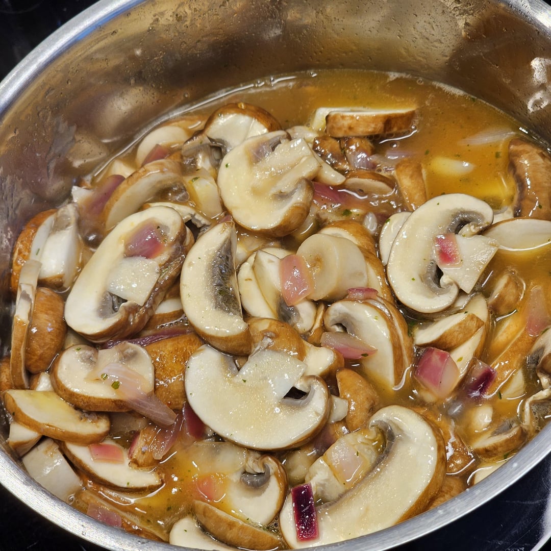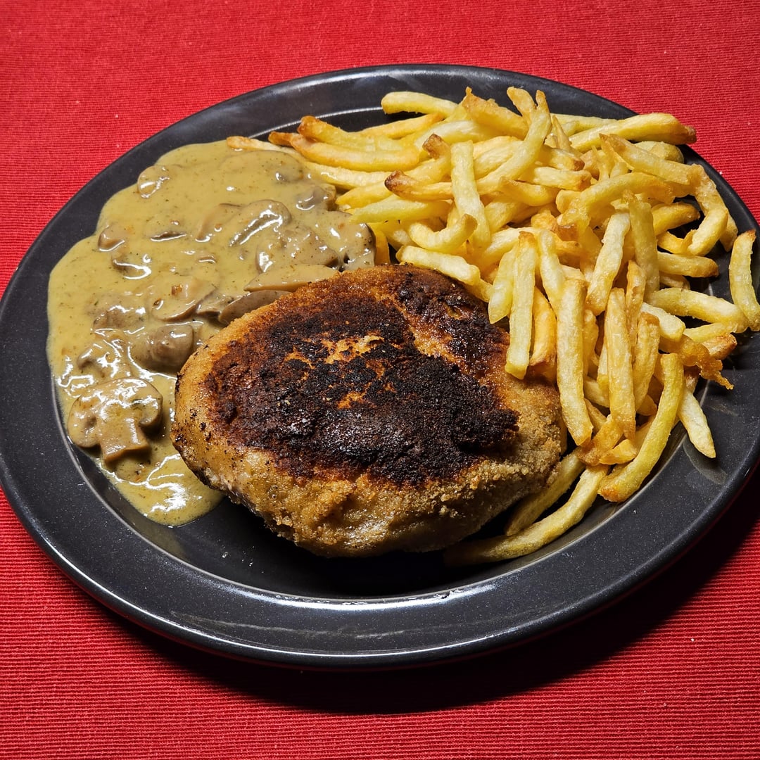 Homemade cordon bleu with mushroom cream sauce, with fries from the hot air fryer