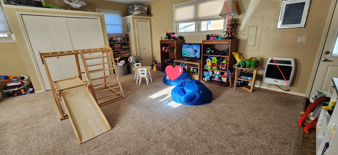 We just moved and it's our first playroom! Luckily almost everything matches but now I feel the room is so blah….Its not a very bright and inviting to me. I have no vision myself on how to make it flow better, if possible. Would like to add a play kitchen or something like at some point. The areas crossed out will be removed and all the closets are full as we use them for storage. Also, if there's an easy way to change the two shelves next to the TV? That dark brown has to go