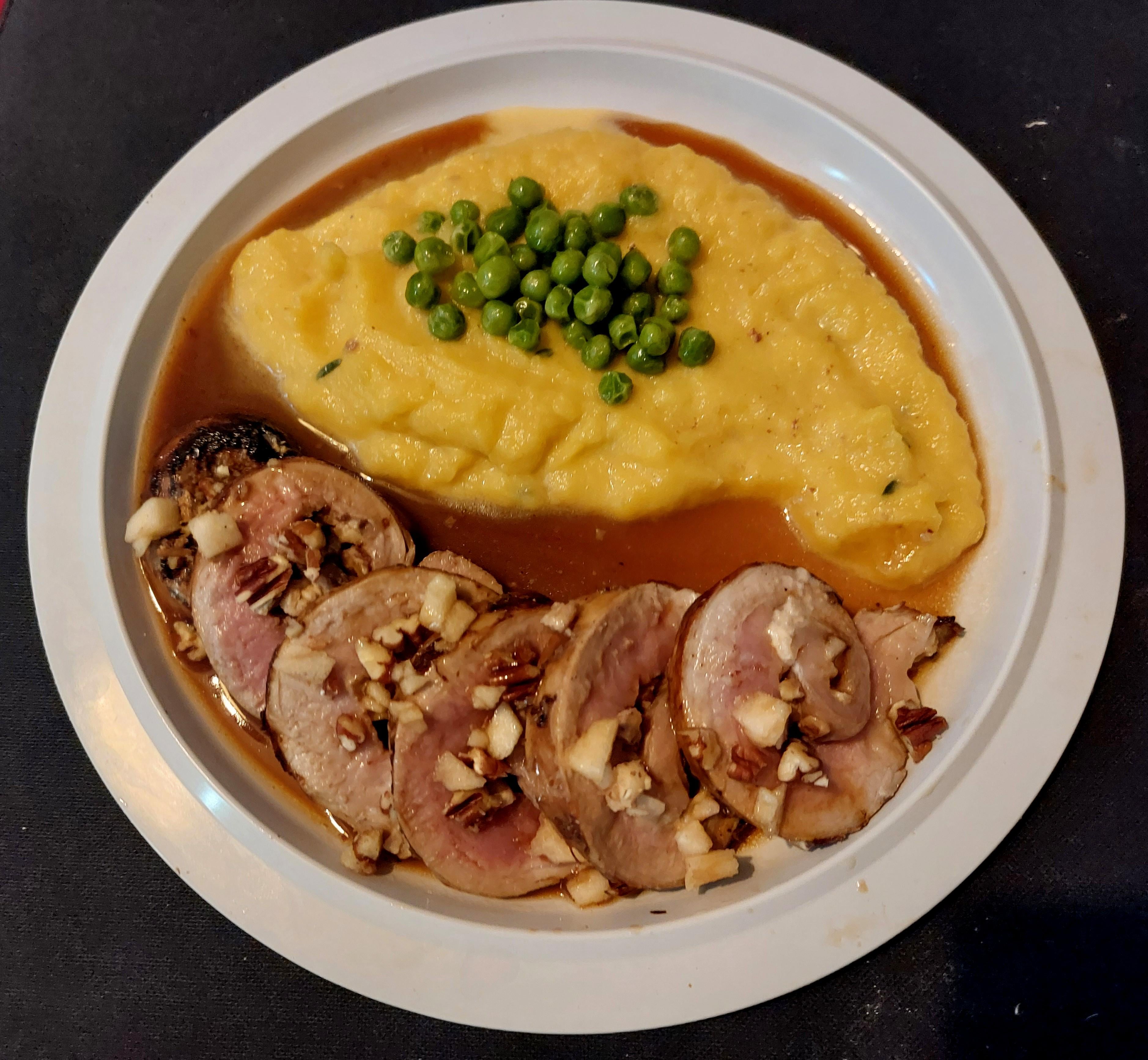 Pork loin roll, stuffed with goat cheese, apple, pecans and apple syrup. With pumpkin mash and a cider jus.
