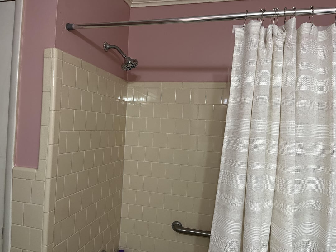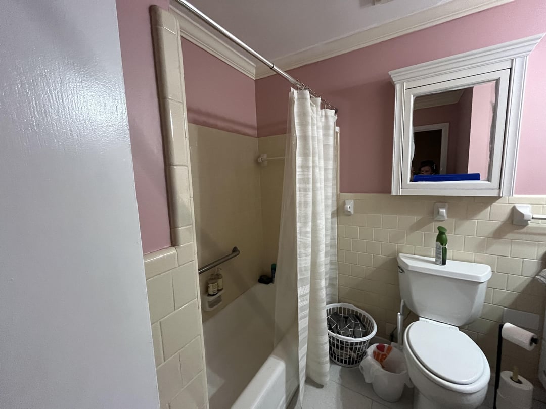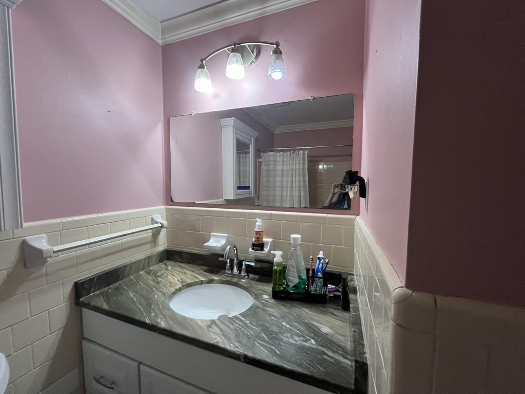 So my husband and I are slowly remodeling our new house and I dislike the wall color I chose for the guest bath. I was originally wanting a mauve/ rose pink color to go with the art I got for the house (built in 1960s so I’m going for grandmillennial vibes) so I chose SW RoseColored and it looks Pepito Bismol pink ☹️ I don’t have any natural light and the vanity lights are horrible, so I plan on replacing the lighting and mirror eventually so hopefully that will be a little better. I was thinking , and all of my coworkers agree , that a dark green would look good , but I’m unsure since I hated my first choice . Everyone has agreed on SW Isle of Pines for the new color? The floors are a light ivory, old school 4×4 cream tiles halfway up the walls and in shower, white vanity cabinet , and Indian green (Northern Lights) soapstone for the counters . I literally work in a design showroom and cannot understand why my guest bathroom is so difficult for me to make decisions 😭 sorry the bathroom is a mess… it’s a work in progress 😅