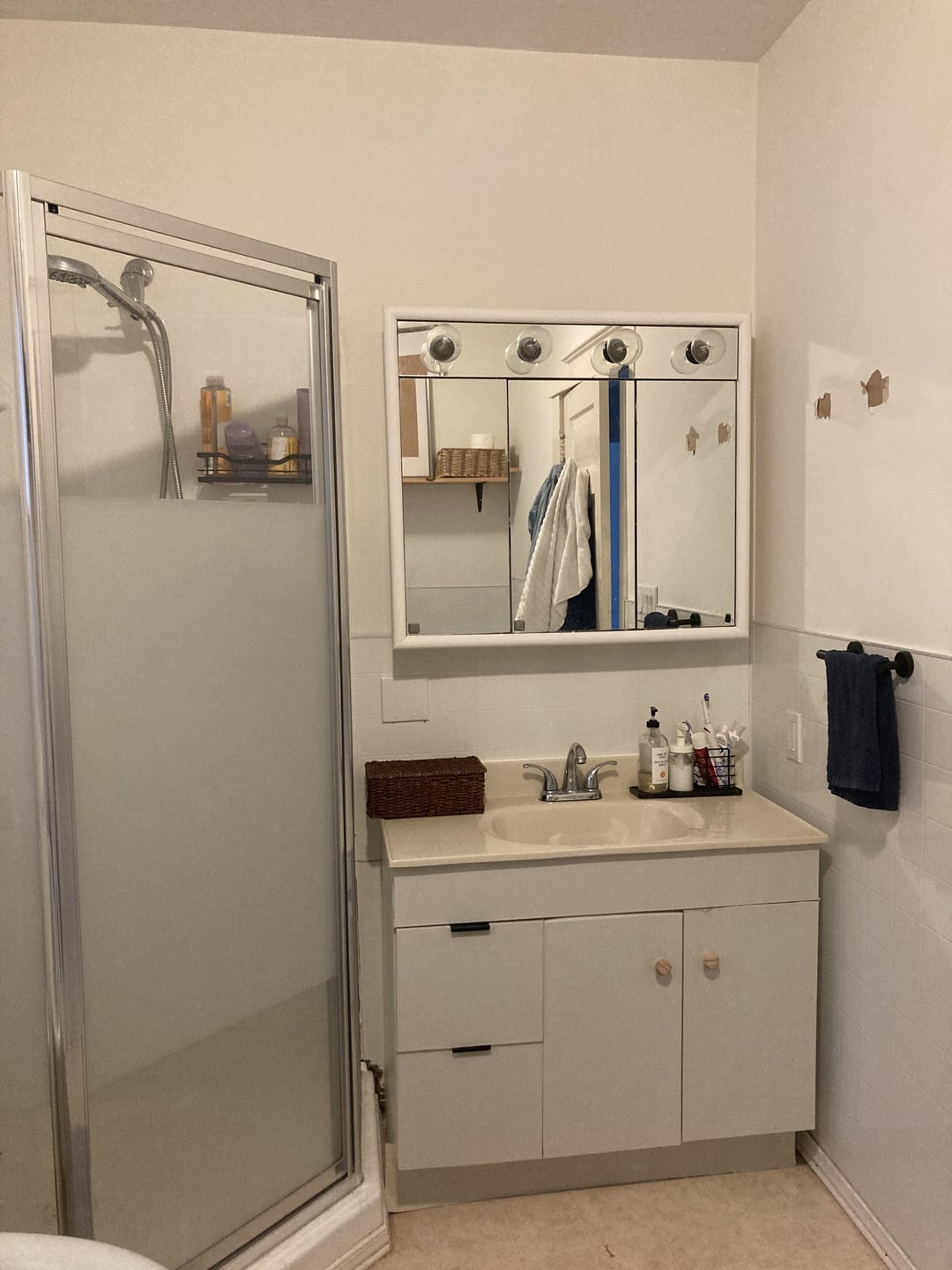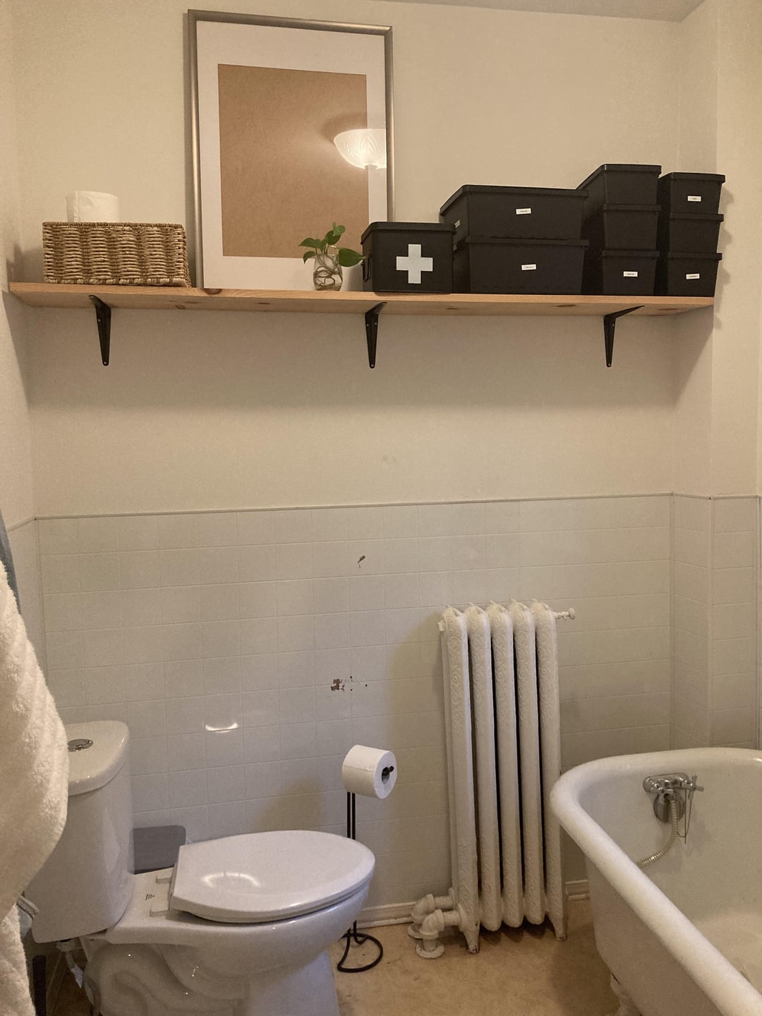 I’ve since added the shelf for storage, and peel-and-stick to the cabinet fronts, but it’s still very crammed and dirty despite scrubbing everything. I was thinking breadboard? Thoughts?