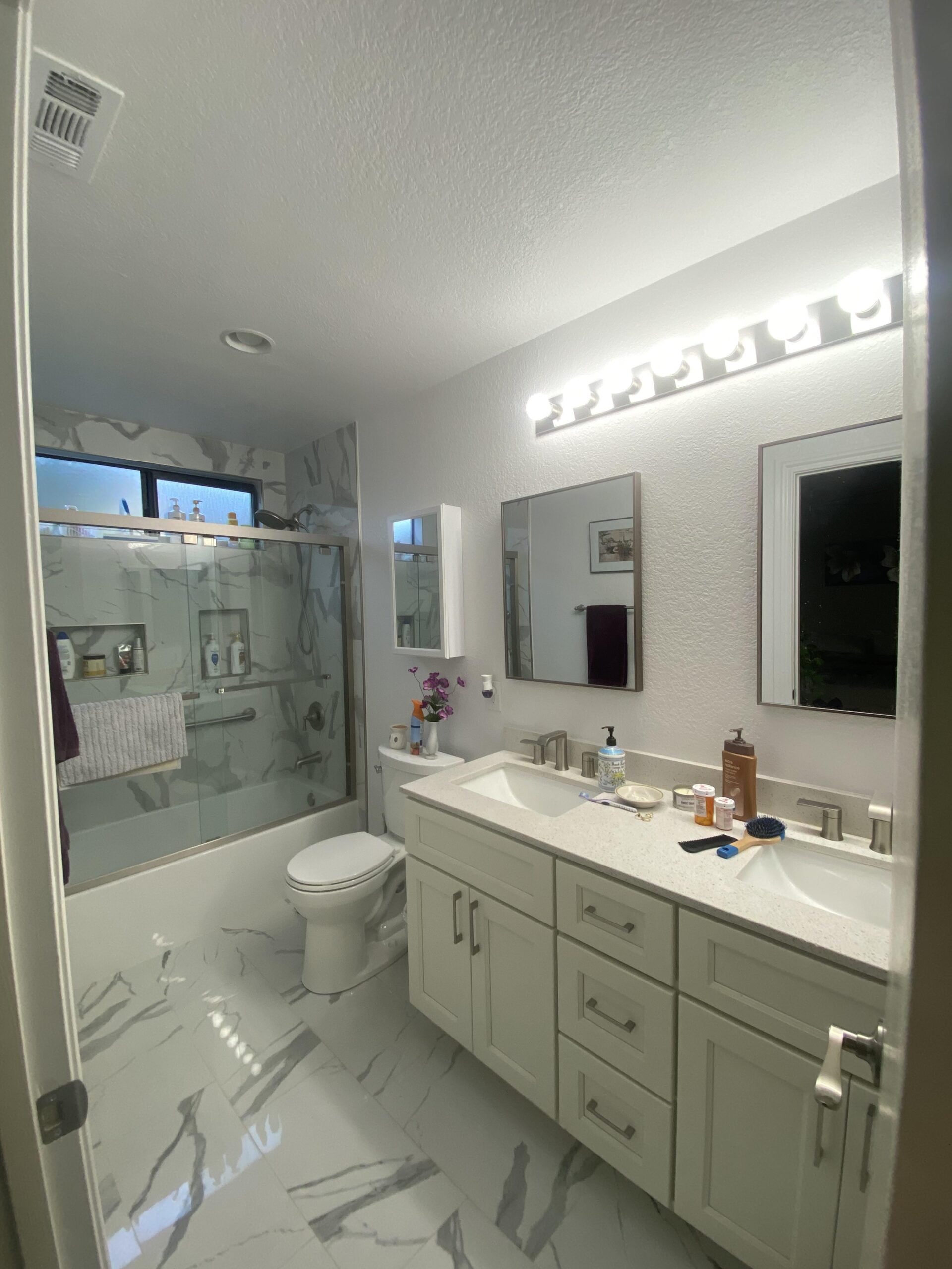 In a few month this will be my bathroom. It’s all brand new basically, but it feels too white and hard for me. I don’t want to repaint it because it has just been professionally painted. What kind of cosmetic facelift could I give her? Bring in some natural elements? Wallpaper? The light does dim so it has a bit of a saving grace. Things like that can change over time, but what could I add to instantly bring is a different kind of feel?
