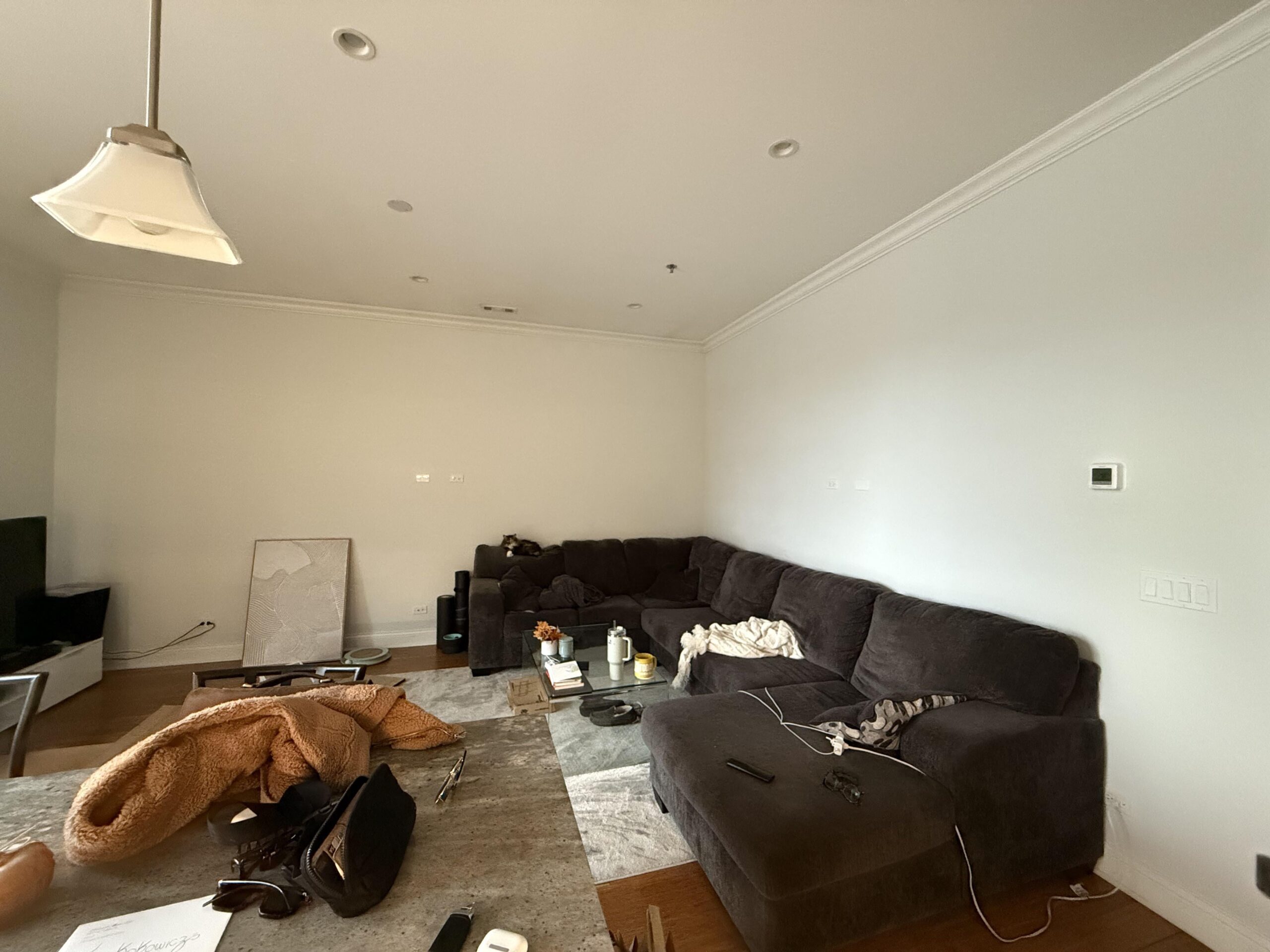 We just moved into a new apartment and I am attempting to decorate these walls in our living room. Ideally, I’d love to cover the outlets on both walls. My husband requested “no shelves or things sticking far out of the wall next to the tv” (so on the wall my cat is on). My vibe is contemporary modern. I attempted 3, 28×40 canvas above the couch on the right wall (no cat wall) and it felt overwhelming. I think I need to shrink the size of canvases to 24×36. We plan on staying here 2 years max so don’t want to spend too much money. Just something to make it more homey. Please help me reclaim my sanity 😣