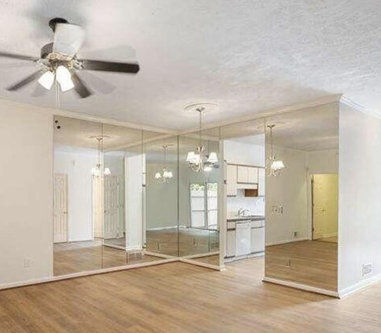 - The space is currently used as an office so I can’t put bookcases/furniture in front of the mirrors because desks are there.
