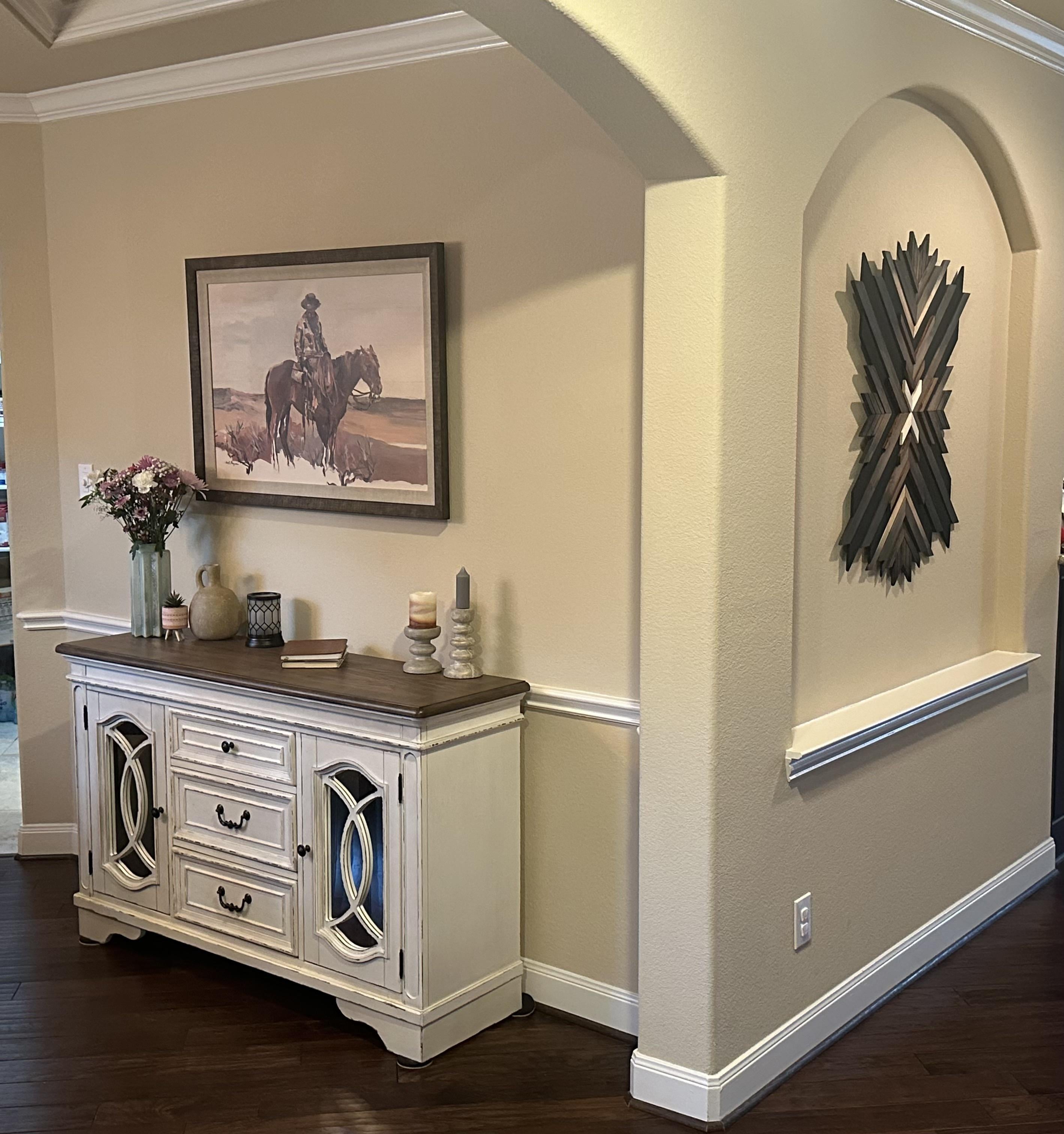 I want to thank the people who suggested getting a vertical piece for the wall niche I posted a few months ago. It was nearly impossible to find something to go into that space that I liked. I ended up finding a shop on Etsy that did these custom wood art pieces and I loved how it turned out. Others suggested to get a new frame around the cowboy picture, which I did. I moved it to an adjacent wall since it fit that space better. Again, I thank y’all for the advice. Y’all feel free to comment on if there’s anything else I should add or take away, but the pictures are staying where they are lol.