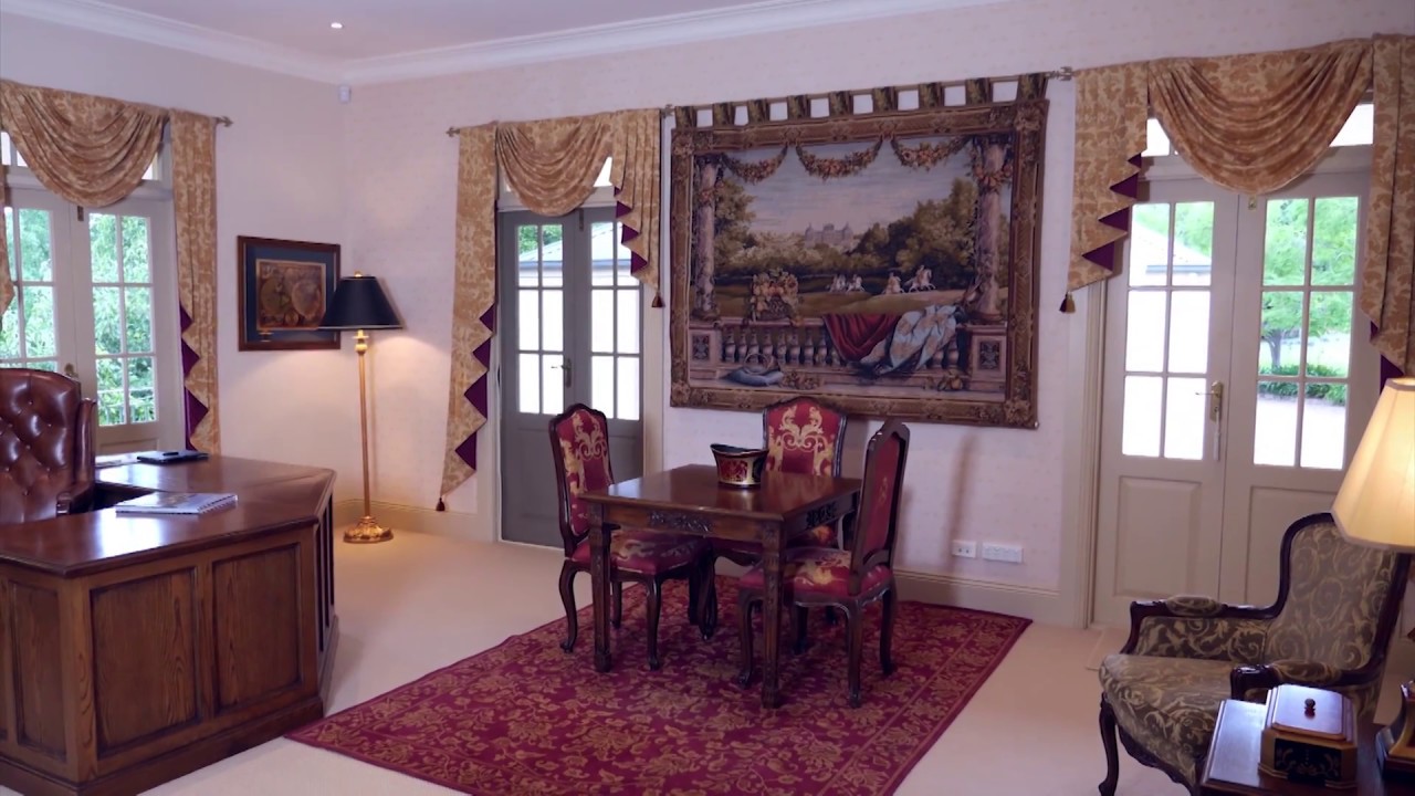With influences of the French medieval period and classic French chateaux, Jean-Christophe has designed a rich, warm office with a masculine feel. The hunting tapestry is complemented by the heraldic motifs that cover the chairs, and by the deep burgundy of the dramatic curtains.