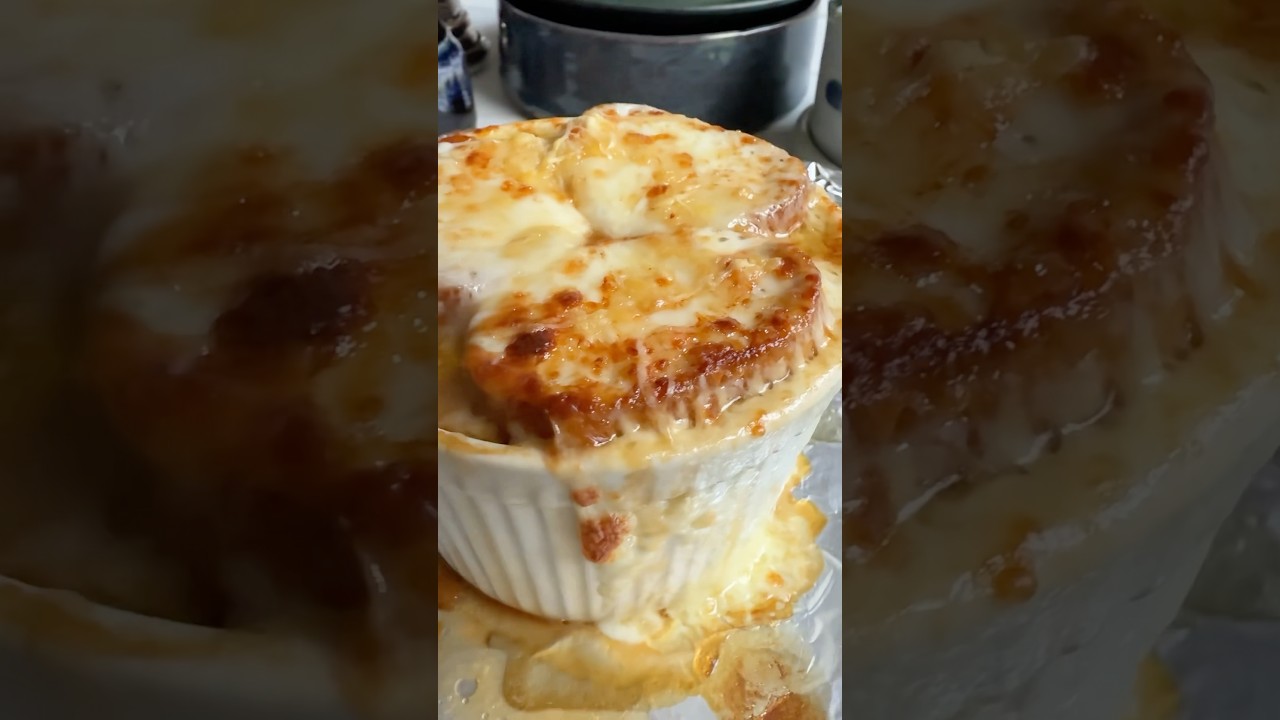 Fill oven safe soup crocks to about a half inch from the top. Add the toasted bread to the top, then top with thinly sliced mozzarella and grated Gruyère. Place on foil lined baking sheet and into preheated oven set to broil. Broil till cheese is melted and brown and bubbly.