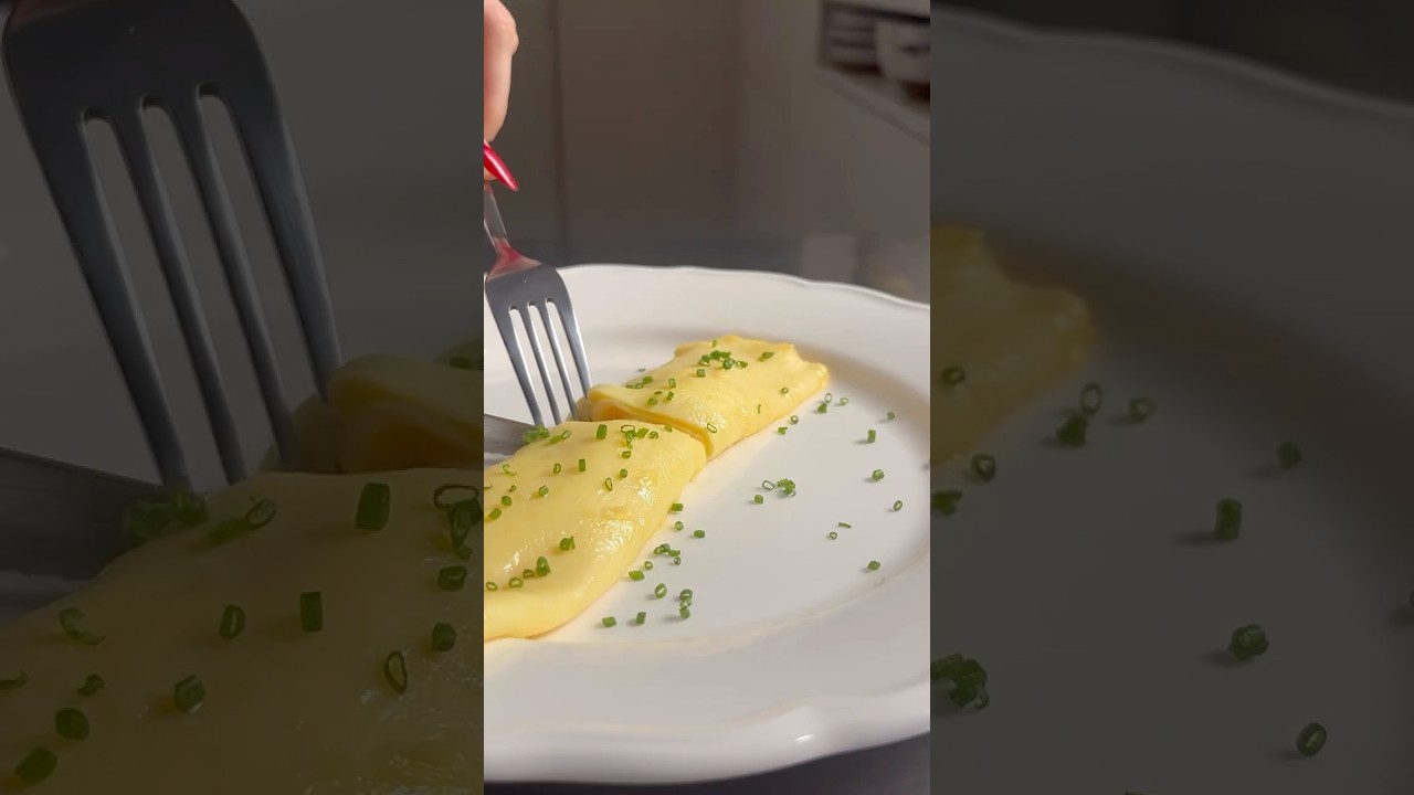French Omelet Recipe 4 large eggs 1 tosp unsalted butter Pinch of salt Crack the eggs into a bowl and add a pinch of salt. Whisk the eggs thoroughly until fully combined. Strain the eggs through a fine mesh strainer into a bowl to remove any lumps and ensure a silky texture. Place a non-stick skillet over medium-low heat. Add the butter and let it melt, swirling it around the pan to coat evenly. Pour the strained eggs into the pan and Immediately begin shaking the pan back and forth while stirring the eggs with a spatula to create small curds. Once the eggs begin to set on the bottom, reduce the heat to low. Continue shaking the pan gently while running the spatula around the edges to keep the omelet from sticking. When the eggs are custardy and mostly set (or cook the eggs to your liking) add some shredded Parmesan or any cheese of choice, use two spatulas to carefully roll the omelet into a log shape. Gently tilt the pan to help roll and transfer the omelet to a plate. Top the omelet with freshly chopped chives.