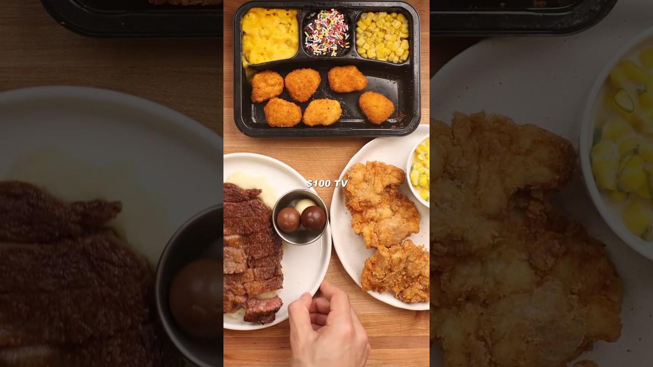 @cherrypopscile3385 1 year ago "Lets make a 1, 10, and 100 dollar meal"Eats one regular ass tv dinner then just cooks food