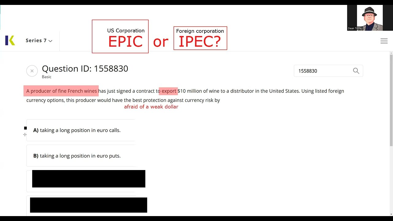 Dean discussed the importance of understanding the Kaplan Qid and its benefits for test takers, and clarified the difference between EPIC and IPEC. He also explained the concept of foreign currency options and how they can protect against currency risk using the example of a French winery exporting wine to the US. Lastly, he encouraged test takers to practice with foreign currency practice questions and offered to answer any explication requests.