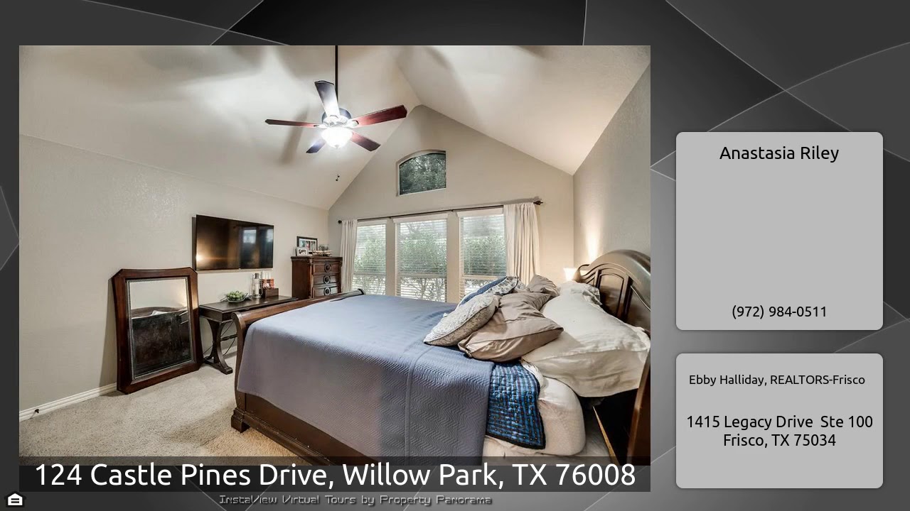 The Virtual Tour for the property at 124 Castle Pines Drive, Willow Park, TX 76008 listed for $259,900: Other homes for sale by Anastasia Riley of Ebby Halliday, REALTORS-Frisco: You will love coming to this Excellent Family Residence gently nestled on a private tree-lined lot in one of the best yet affordable communities serviced by highly sought after Aledo schools. Picture perfect curb appeal w southern porch & lush landscaping w mature trees. The floorplan is abundantly spacious & flows effortlessly boasting an inviting entry flanked by a handsome study w french doors & elegant dining. …