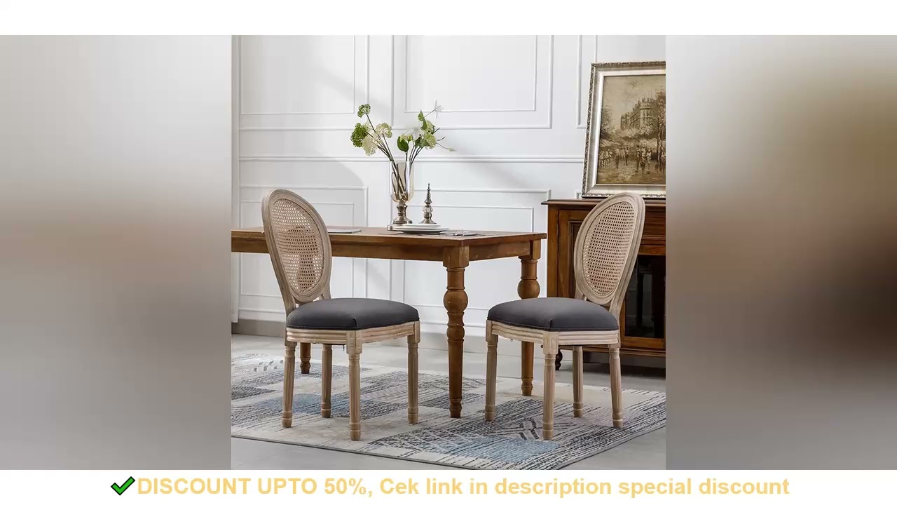 French Style Solid Wood Frame Linen Fabric Rattan Back Dining Chair,Set of 2,Gray