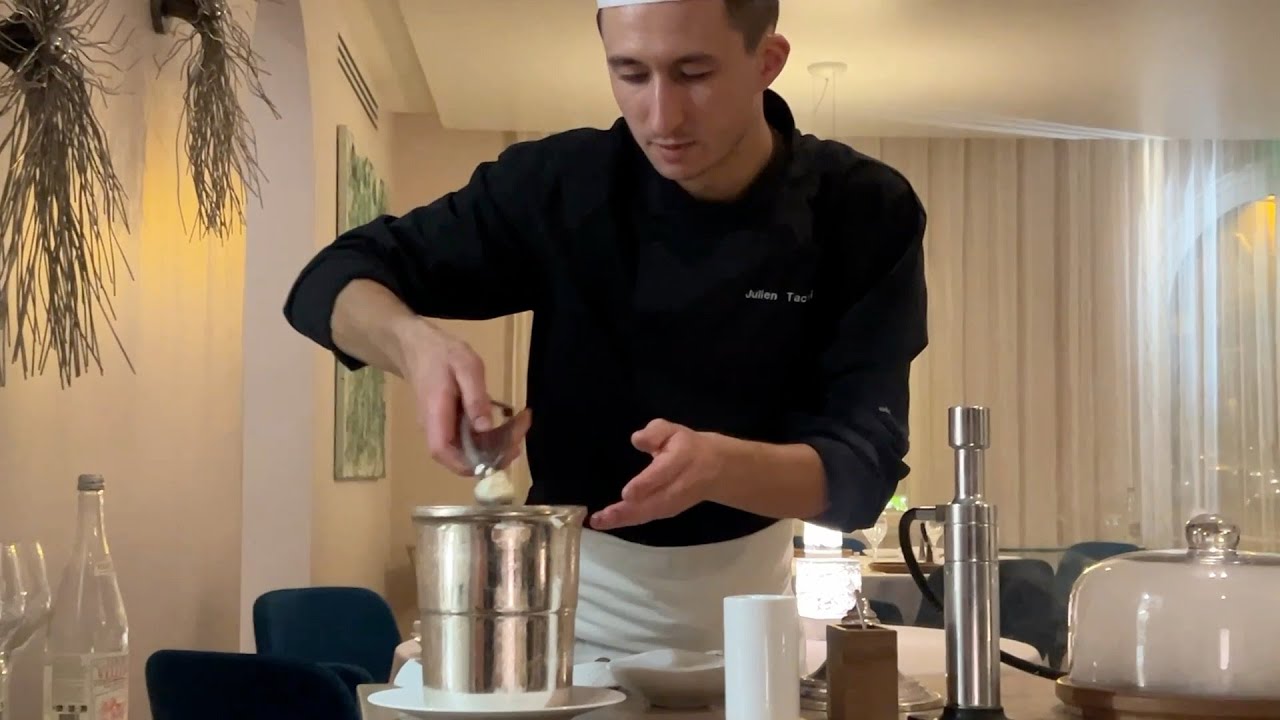 Dinner started with amuse-bouches, including a savory mushroom tea, cabbage and cheese tarts, lentils, and pâté. Bread was served with #Frenchbutter and hazelnut oil. Another starter was a delicate slice of #Charolaise #beef, smoked in beechwood right at tableside, and served with mustard ice cream of Edmond Fallot Dijon 🤤. Next a raw trout fillet with nuts, then filets of Charolaise #beef. (Meanwhile, pescatarian @eloiseinparis8 had a fine lobster dish.) Fast forward to dessert, a soufflé with ice cream, and other delicious things to raise my cholesterol before bed. 🙌🏽 — Eating where the tire guy said to, at #MaisonDoucet, #Charolles, #France, along the @ValleDeLaGastronomie. 🇫🇷