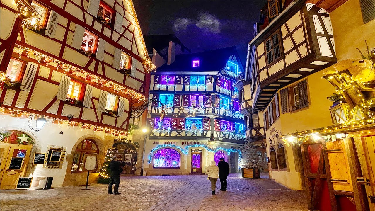 Colmar France Christmas time, early Renaissance city in Alsace Haut-Rhin wine country showing beautiful Little Venice, St Martin Cathedral in December 2019