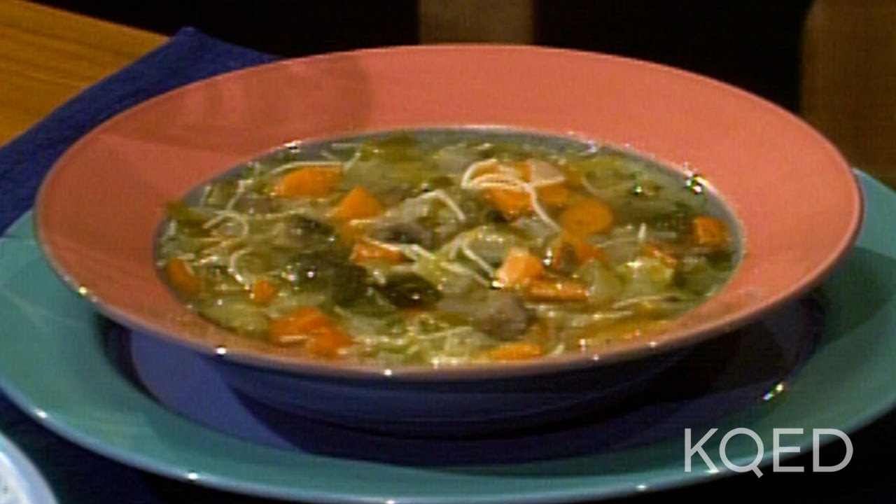 Jacques Pepin’s vegetable soup is made with hearty fall vegetables like yam and leek and uses crushed angel hair pasta for thickening. (1:00). For the main course, Jacques shares his technique for cooking flavorful lentils (5:36) to serve with grilled cabbage stuffed with sausage (10:56). For dessert, Jacques prepares a fig and pear gratin (15:29). Lots of great cooking tips and techniques in this episode!