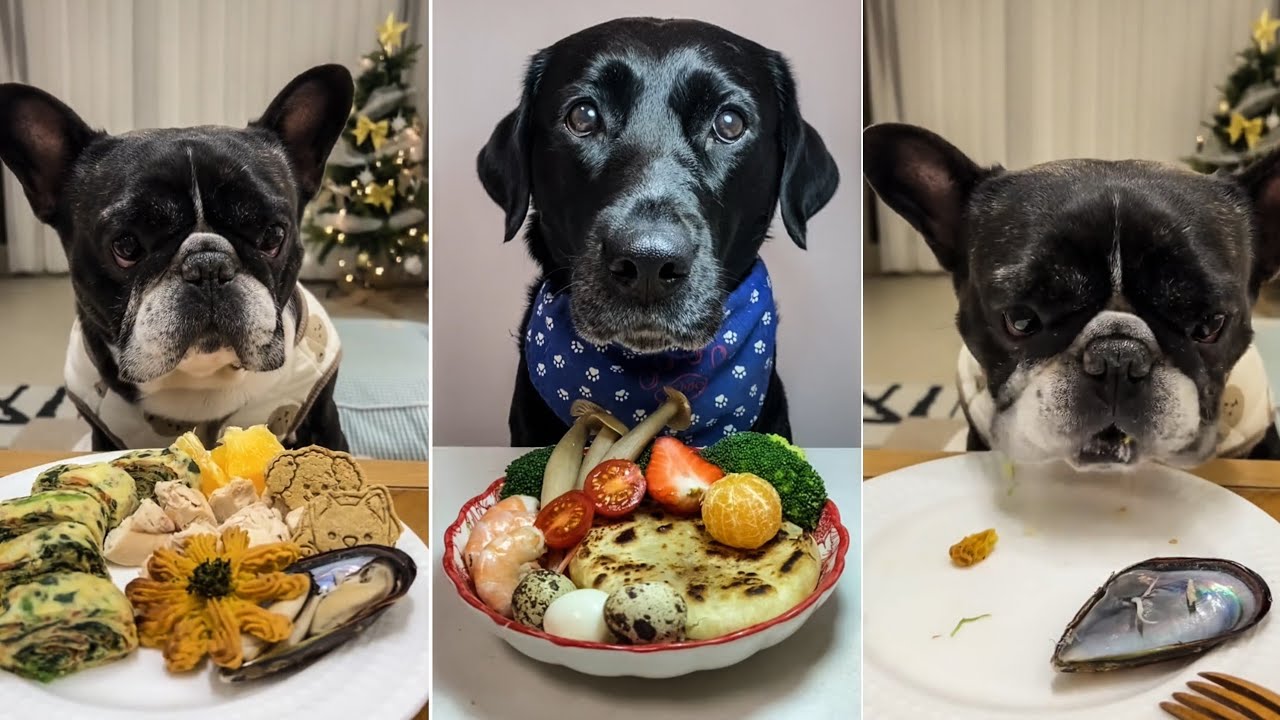 Meanwhile, our French Bulldog savored a unique spread of spinach and vegetable omelet rolls, tender chicken breast, orange slices, bone-shaped biscuits, a decorative pumpkin-flower snack, and even a mussel!