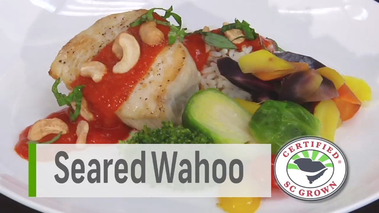 Chef Tom Mullally showcases a mouthwatering recipe featuring seared local Wahoo, Carolina rice, and vibrant local vegetables. Topped with a unique roasted sweet red pepper cashew sauce, this beautifully plated dish celebrates fresh, regional ingredients.
