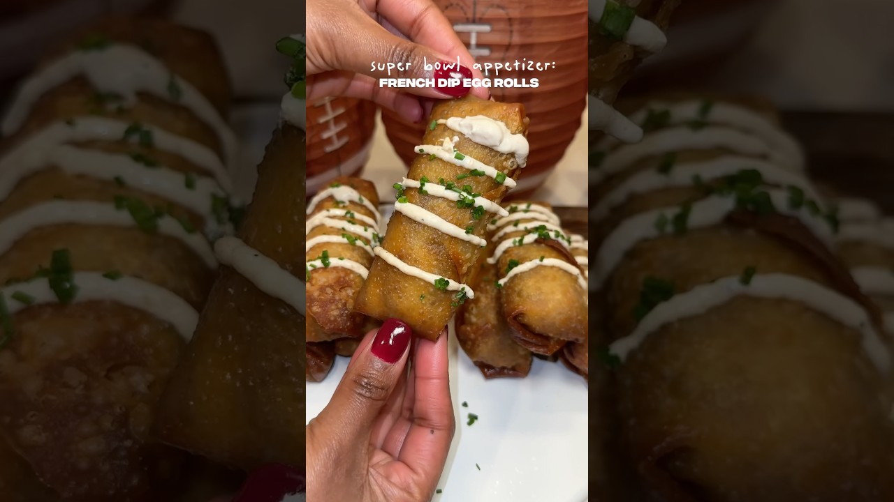 What you'll need: makes 7-8 egg rolls • 1lb of shaved rib-eye steak • 1 yellow onion (sliced) • au jus packet • 1 tsp of balsalmic vinegar • swiss cheese (shredded) • chives for garnish • horseraddish cream • salt & pepper • vegetable oil