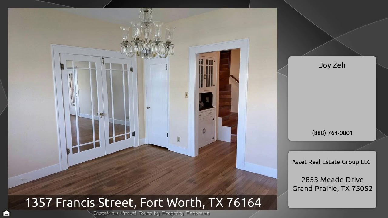 The Virtual Tour for the property at 1357 Francis Street, Fort Worth, TX 76164 listed for $1,750: Other homes for sale by Joy Zeh of Asset Real Estate Group LLC: 1930's Home with great curb appeal. Freshly painted with over $40,000 in upgrades and repairs. Features include new energy-efficient windows, new kitchen and bathroom cabinets, ceramic floor with granite countertops in kitchen, bathroom has new cabinets and flooring, refinished wood floors throughout the majority of rooms. 1930's glass French doors open to a nice size dining room. Electric Fireplace, cordless mini blinds throughout …
