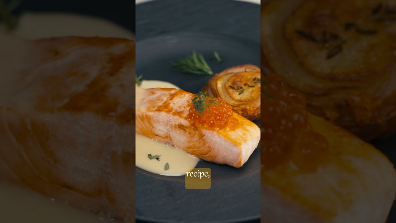 juicy salmon steak with crispy potatoes and delicate Beurre Blanc sauce – the perfect combination for gourmet lovers! Golden-seared salmon fillet, a side of roasted potatoes, and a creamy sauce with hints of white wine and lemon. This exquisite French sauce adds elegance and an incredibly delicate flavor to the dish. The presentation looks stunning, making it perfect for a special occasion or a cozy dinner.
