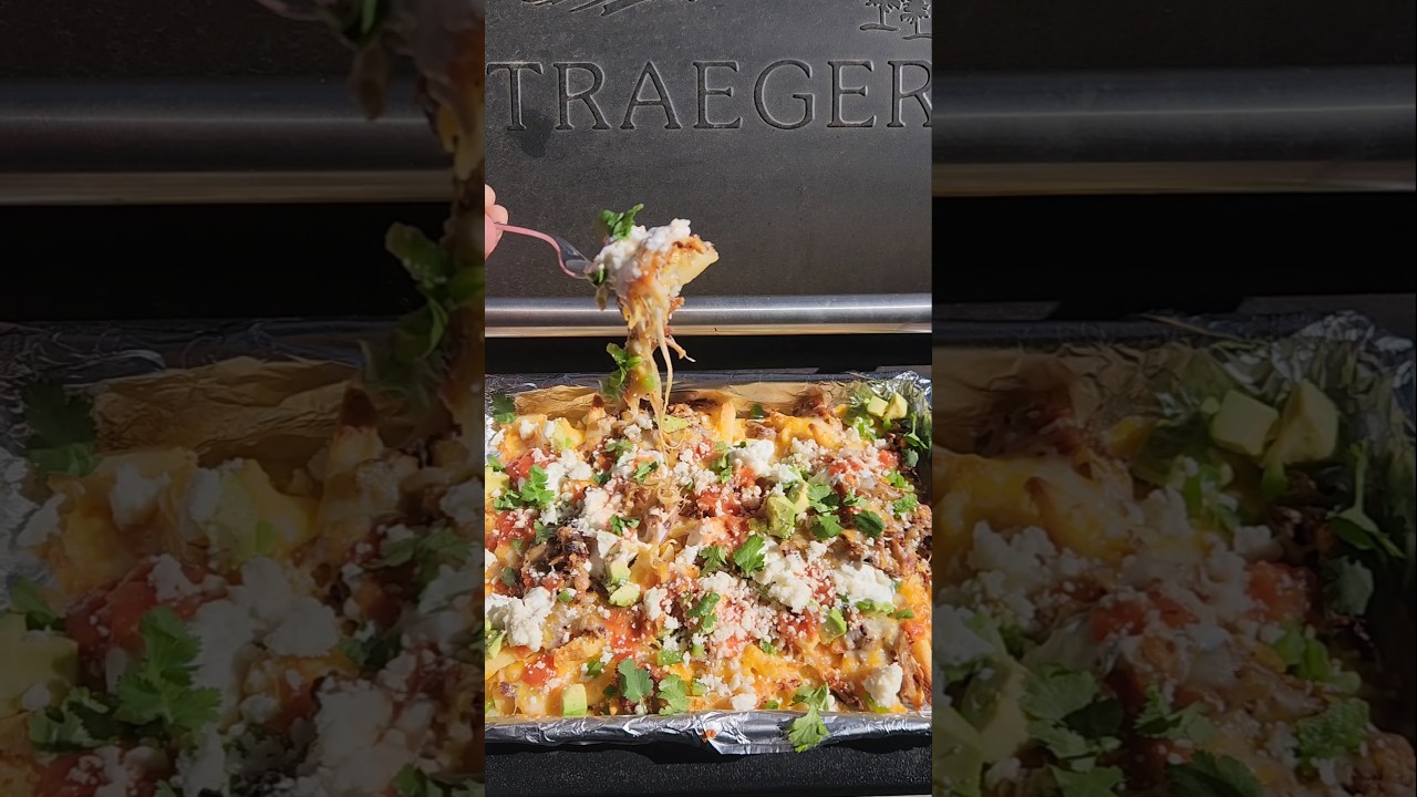 Happy gameday! Need a twist on the classic nachos? Try em with some nice crispy french fries! We took some frozen french fries and threw them on the Traeger on high. Once they started to crisp they were pulled and topped with smoked shredded pork and shredded cheese, then they went back on. Once they were nice and melted they were pulled and topped with avacado, jalapeño, sour cream, salsa, Cacique Queso Fresco and cilantro before being served.