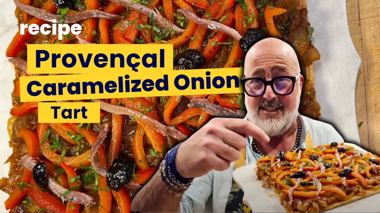 Emblematic of the culinary traditions of Nice, it’s a pastry base topped with caramelized onions, olives and anchovies. I add roasted peppers for texture and sweetness.