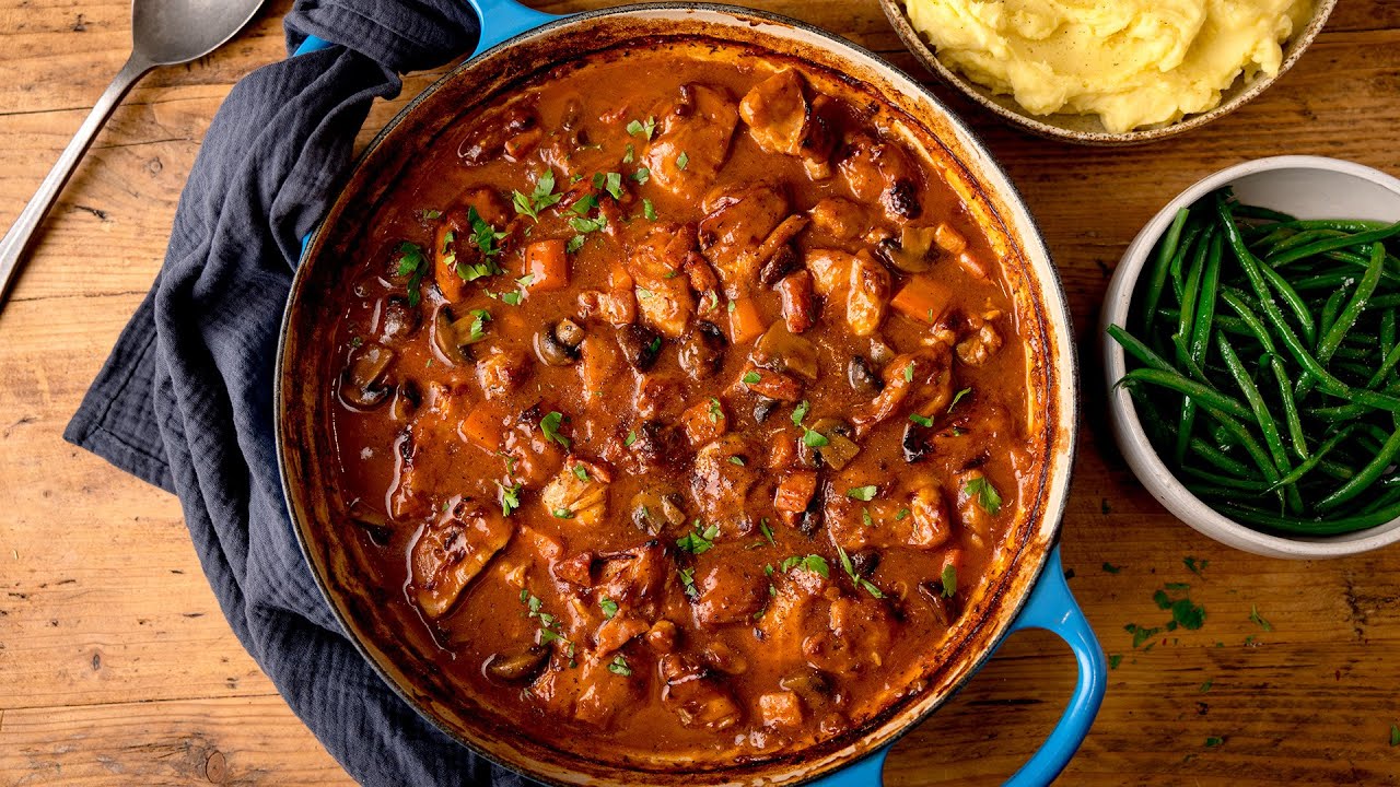 My version is made with chicken thigh fillets – rather than the traditional bone-in chicken legs. It’s amazing served on top of creamy mashed potatoes.