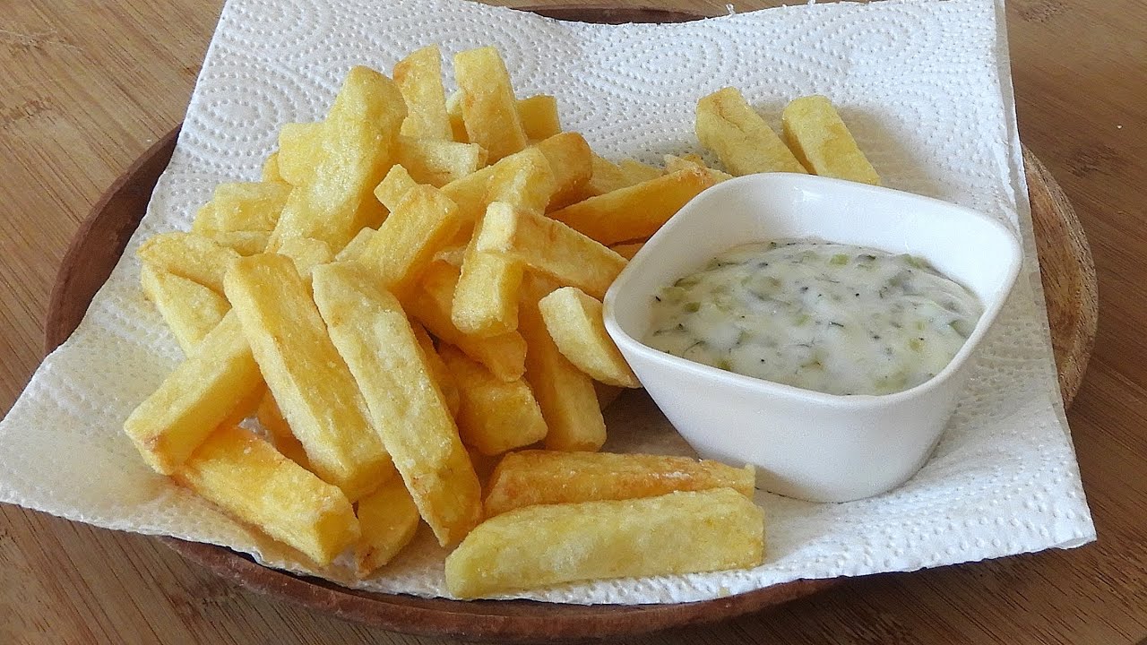 بطاطس مقطعة إلى أعواد سميكة، تُغلى لمدة 5 دقائق، وتُصفى.