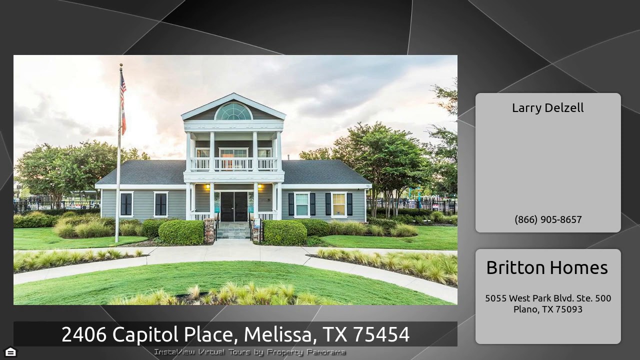 The Virtual Tour for the property at 2406 Capitol Place, Melissa, TX 75454 listed for $489,900: Other homes for sale by Larry Delzell of Britton Homes: PERRY HOMES NEW CONSTRUCTION! Library with French doors and dining room frame the entry with 12-foot coffered ceiling. Ceramic tile floors throughout. Island kitchen opens to family room, morning area and game room with French door entry. Family room with ceramic tile floor features wood mantel fireplace and wall of windows. Spacious master suite with dual sinks, garden tub, separate glass-enclosed shower and walk-in closet in the master …