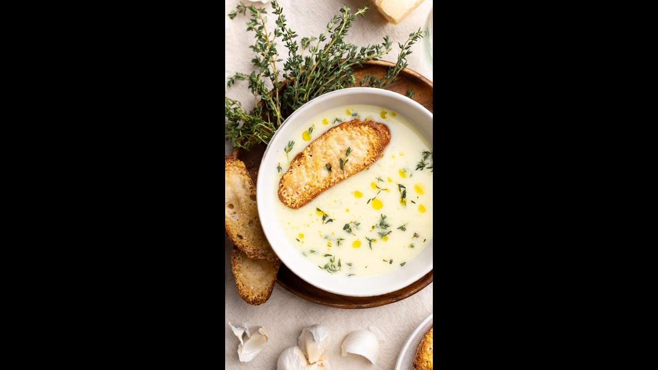 Ingredients (serves 4) 2 tablespoons salted butter 1 small white onion, minced 2 heads of garlic (24 cloves), sliced in half 2 thyme sprigs ½ teaspoon dried sage Kosher salt, to taste 8 cups chicken broth 2 tablespoons cornstarch Parmesan cheese rind plus ¼ cup finely grated Parmesan 3 large eggs ½ baguette (about a 12-inch piece), cut diagonally in ⅓-inch slices 1 cup shredded parmesan cheese 1. Preheat the oven to 425°F (220°C). In a pot, melt the butter over medium heat. Once hot, add the onion, garlic, thyme, sage, and a generous pinch of salt. Sauté on low for about 5 minutes, or until the garlic starts to soften. Add the broth, cornstarch, and Parmesan rind, then simmer over low heat for 15 minutes. Use an immersion blender or a regular blender to blend the soup until smooth. 2. In a large bowl, beat the eggs. Slowly drizzle in 2–3 cups of hot soup while continuously whisking to temper the eggs. Add the tempered egg mixture back to the soup. (Make sure the heat is off to prevent scrambling the eggs.) Bring the soup to a gentle simmer over low heat, then remove from heat, and toss in the ¼ cup grated Parmesan cheese. 3. While the soup is cooking, coat the baguette slices equally with the 1 cup shredded Parmesan cheese. Toast them on a baking sheet in the preheated oven for 10–12 minutes, until the cheese is crisp. 4. For added heartiness, stir shredded chicken, cooked rice, or roasted vegetables into the cooked soup.