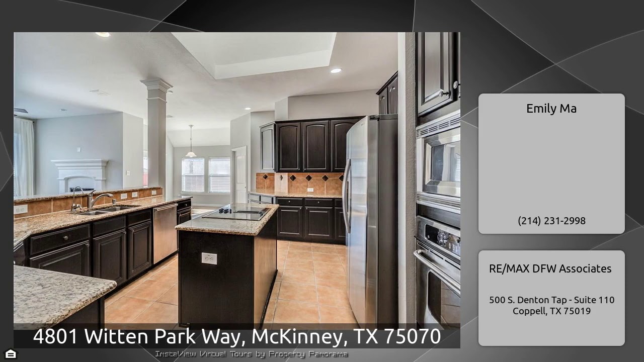 The Virtual Tour for the property at 4801 Witten Park Way, McKinney, TX 75070 listed for $349,900: Other homes for sale by Emily Ma of RE/MAX DFW Associates: Beautiful one story home in excellent location with great school district. New fresh paint, laminate floor in all the bedrooms and living rooms, split bedroom, dining room with french door and study with french door, two living space, large kitchen with granite countertop, beautiful front elevation with stone and L shape garage, oversized garage, close to shopping mall and easy access to 121 and 75, excellent elementary school, …