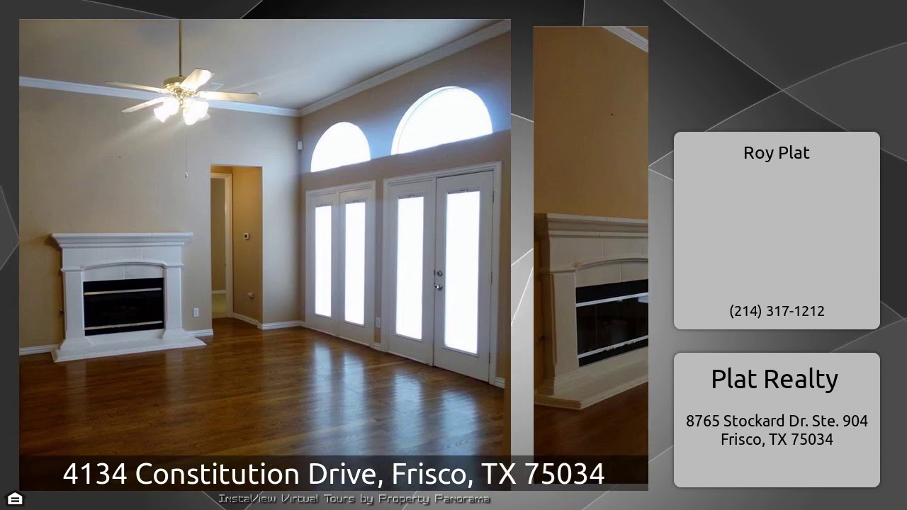 The Virtual Tour for the property at 4134 Constitution Drive, Frisco, TX 75034 listed for $2,500: Other homes for sale by Roy Plat of Plat Realty: Welcome to this elegant 1 story home in the Herigate Lakes gated community. Conveniently located near the Dallas North Toll way and the Stonebriar Center. Walk into hardwood floors, tall ceilings and crown molding. Kitchen with granite counter tops, large island, double ovens and swing doors into the dining room that include french doors that open to additional porch area. Private master bedroom split from the secondary bedrooms with en suite …