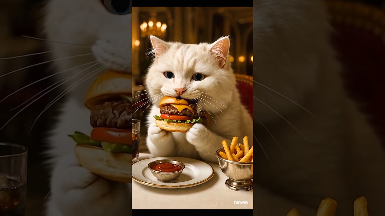 Watch this adorable chubby white cat indulge in a meal of fries and a burger at a luxurious five-star restaurant. From crispy fries to a juicy burger, experience fine feline dining like never before. Don’t forget to like, comment, and subscribe for more delightful feline adventures!