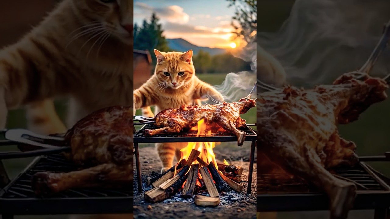 In this set of high – definition realistic images, the orange cat embarks on a series of unexpected actions. First, it searches for tools in the utility room, then rides a tricycle to the woods and sets a trap, successfully luring and trapping a goat. After that, it skillfully prepares to roast the goat in its own courtyard and finally enjoys the delicious food with great pleasure. Each shot is meticulous, truly restoring the actions and expressions of the orange cat and the goat. Come and watch the wonderful “performance” of the orange cat. #RuralOrangeCat #LuringAndTrappingGoat #foodmaking #OutdoorScene #AnimalMovements #HighDefinitionShot