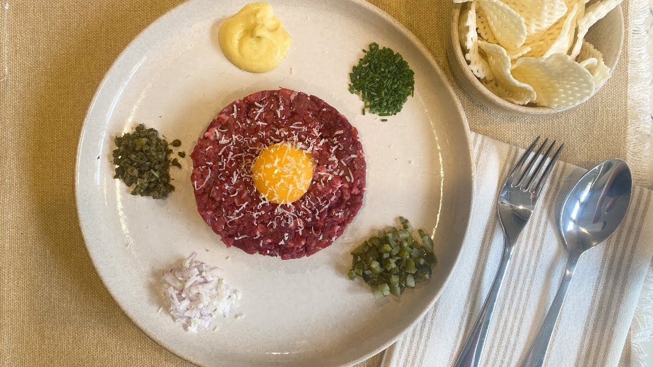 Learn how to make the perfect Steak Tartare at home! This French classic features finely diced eye fillet (beef tenderloin), topped with a rich egg yolk and served with shallots, capers, cornichons, Dijon mustard, and chives. Each accompaniment is served separately, so you can customise the flavours to your taste. Serve with toasted baguette slices or potato chips for the perfect crunch!