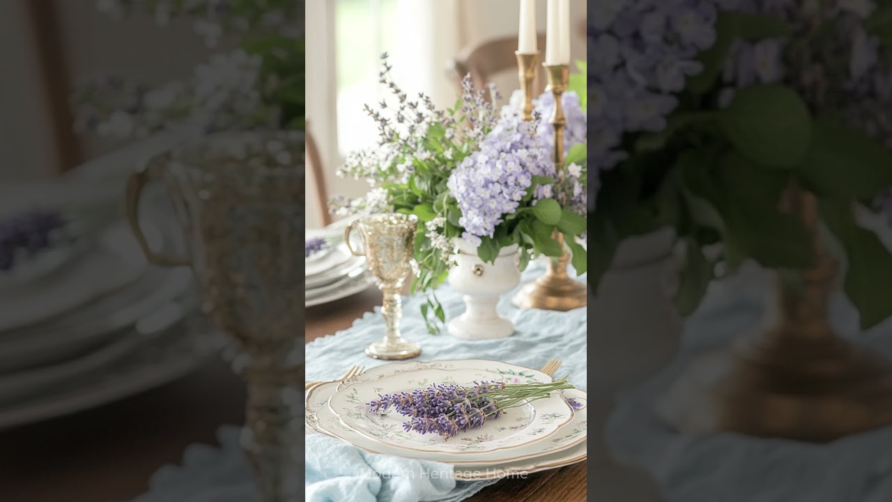 A vintage French farmhouse dining table is elegantly set with soft blue linen runners, gently cascading over its weathered wooden surface. Delicate antique plates with floral patterns, brass candlesticks with flickering flames, and a rustic centerpiece of fresh hydrangeas and lavender create a timeless, inviting atmosphere. The warm glow of natural light filtering through lace curtains enhances the table’s charm, making it the perfect setting for a cozy spring gathering