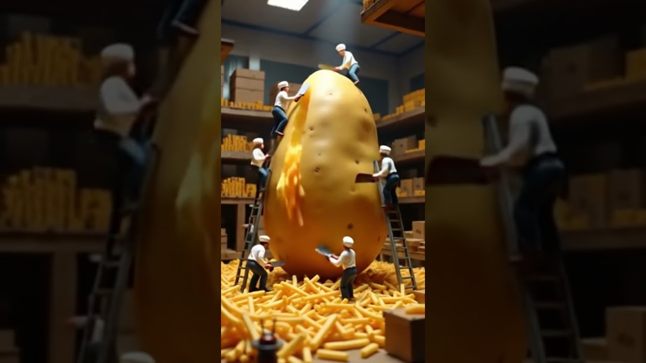 Watch this fun and imaginative mini-world where tiny people harvest a giant potato and turn it into delicious fries — all with miniature tools, factories, and cranes!