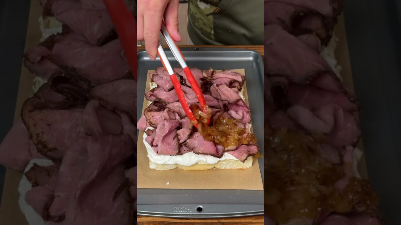 2. To the bottom of the rolls add a layer of French onion dip, followed by roast beef, caramelized onions and Swiss cheese.