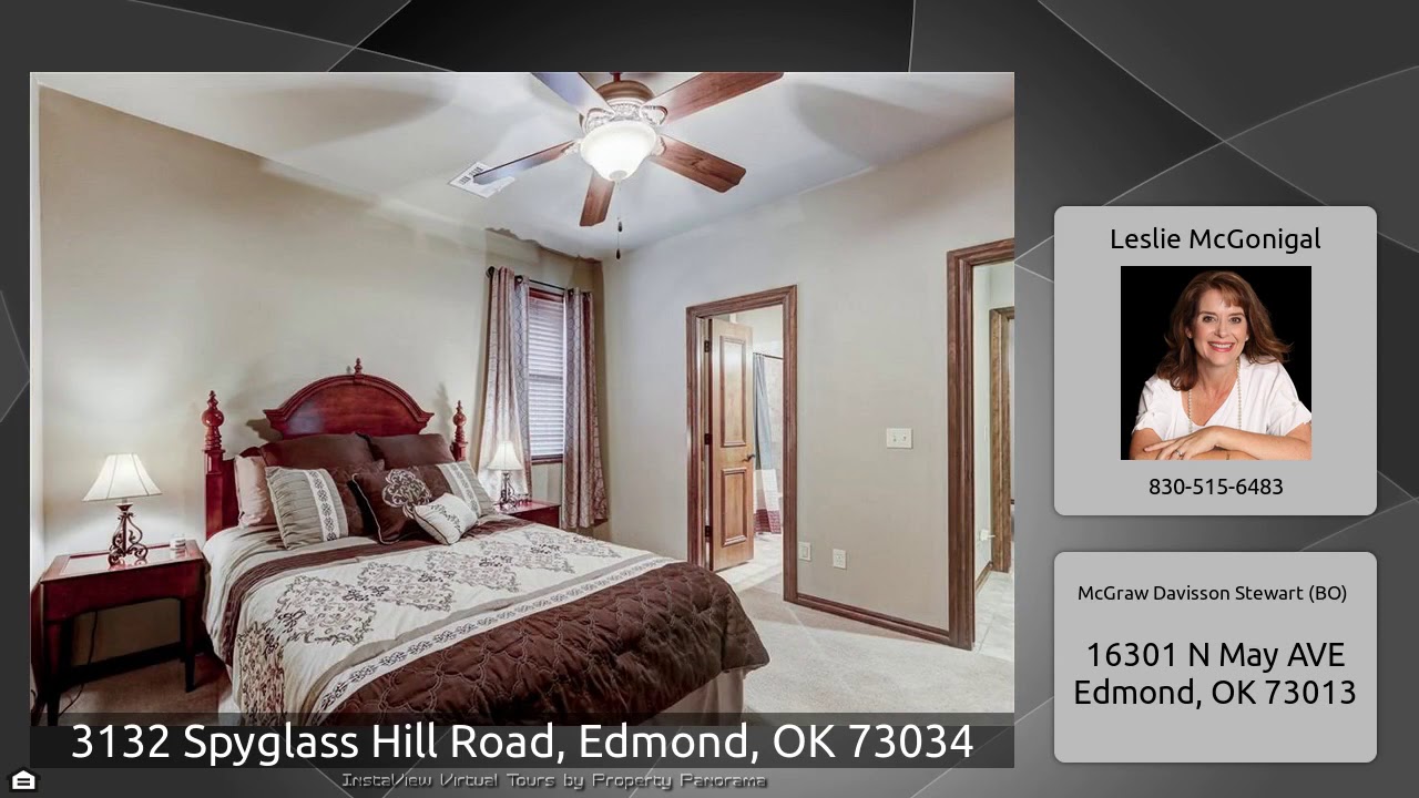 The Virtual Tour for the property at 3132 Spyglass Hill Road, Edmond, OK 73034 listed for $350,000: Other homes for sale by Leslie McGonigal of McGraw Davisson Stewart (BO): Stunning home in the golf course community of Fairfax Estates. Lovely entry with a stately office to the right (with transom/French doors & plantation shutters)-to the left a large formal dining that opens into the great room. Beautiful wood floors run throughout. The great room (with custom mill work, majestic fireplace, & surround sound) is open to the kitchen. The well-appointed kitchen is gorgeous and boasts granite …