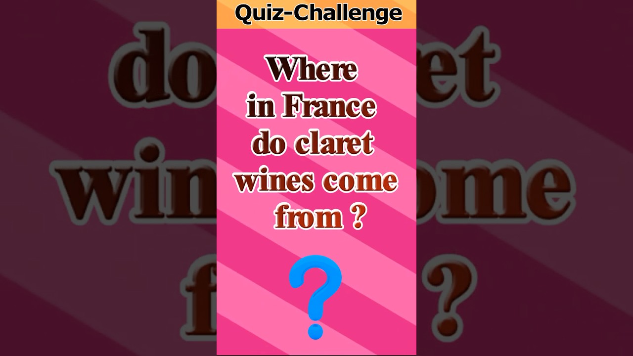 Where in France do claret wines come from ? | Quiz challenge – 188 #shorts#quiz #quizshorts #knowledgequiz #knowledgefacts #quizchallenge challengeClaretFranceFrenchfrench wineGeneralKnowledgegkquizQUIZQuizAddictQuizLoverQuizTimeShortsVideoVlogWineWinesYouTubeWrite A CommentYou must be logged in to post a comment.