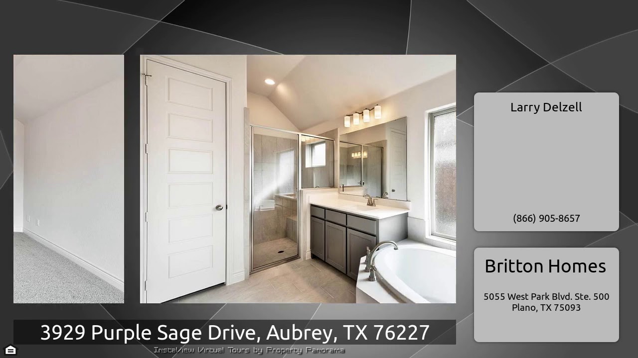 The Virtual Tour for the property at 3929 Purple Sage Drive, Aubrey, TX 76227 listed for $419,900: Other homes for sale by Larry Delzell of Britton Homes: PERRY HOMES NEW CONSTRUCTION READY FOR MOVE-IN! Mahogany front door welcomes with a 12-foot ceiling. Kitchen features an island with built-in seating space. Dining area with a wall of windows. Game room with French doors. Open family room with a wall of windows. Secluded master bedroom with a wall of windows. Double doors lead to master bath with dual vanities, corner garden tub, a separate glass enclosed shower and a large walk-in …