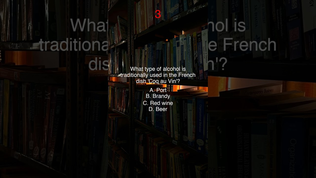 What type of alcohol is traditionally used in the French dish ‘Coq au Vin’?A. Port B. Brandy C. Red wine D. BeerTags: food_and_drink #svastikkka #quiz #shorts #trivia #america #europe #india alcoholCoqdisheducationfood_and_drinkFranceFrenchfrench wineQUIZTraditionallytriviaTypeVideoVinVlogWineYouTubeWrite A CommentYou must be logged in to post a comment.